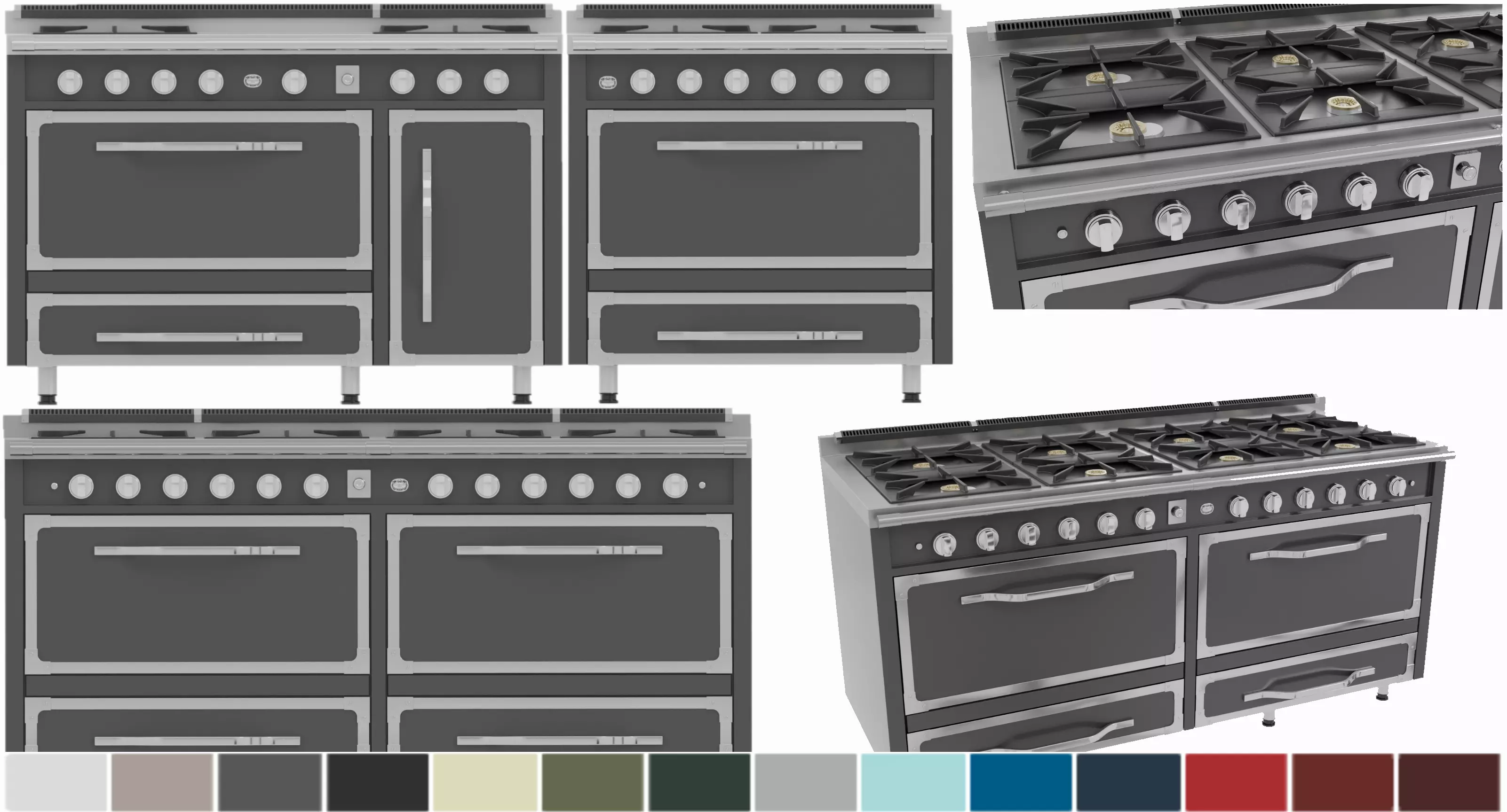 -Freestanding Range with 8 Burners-66inch, Freestanding Range with 4 Burners and Flat Top-48inch, and Freestanding Range With 4 Burners-36inch models with 15 Material sets... Alluvial-Blue, Antique-White, Arctic-Grey, BlackForest-Green, ByWater-Blue, Cast-Black, Cypress-Green, Damascus-Grey, Frost-White, Kalamata-Red, Pacific-Grey, Reduction-Red, SanMarzano-Red, Slate-Blue, Vanilla-Cream.