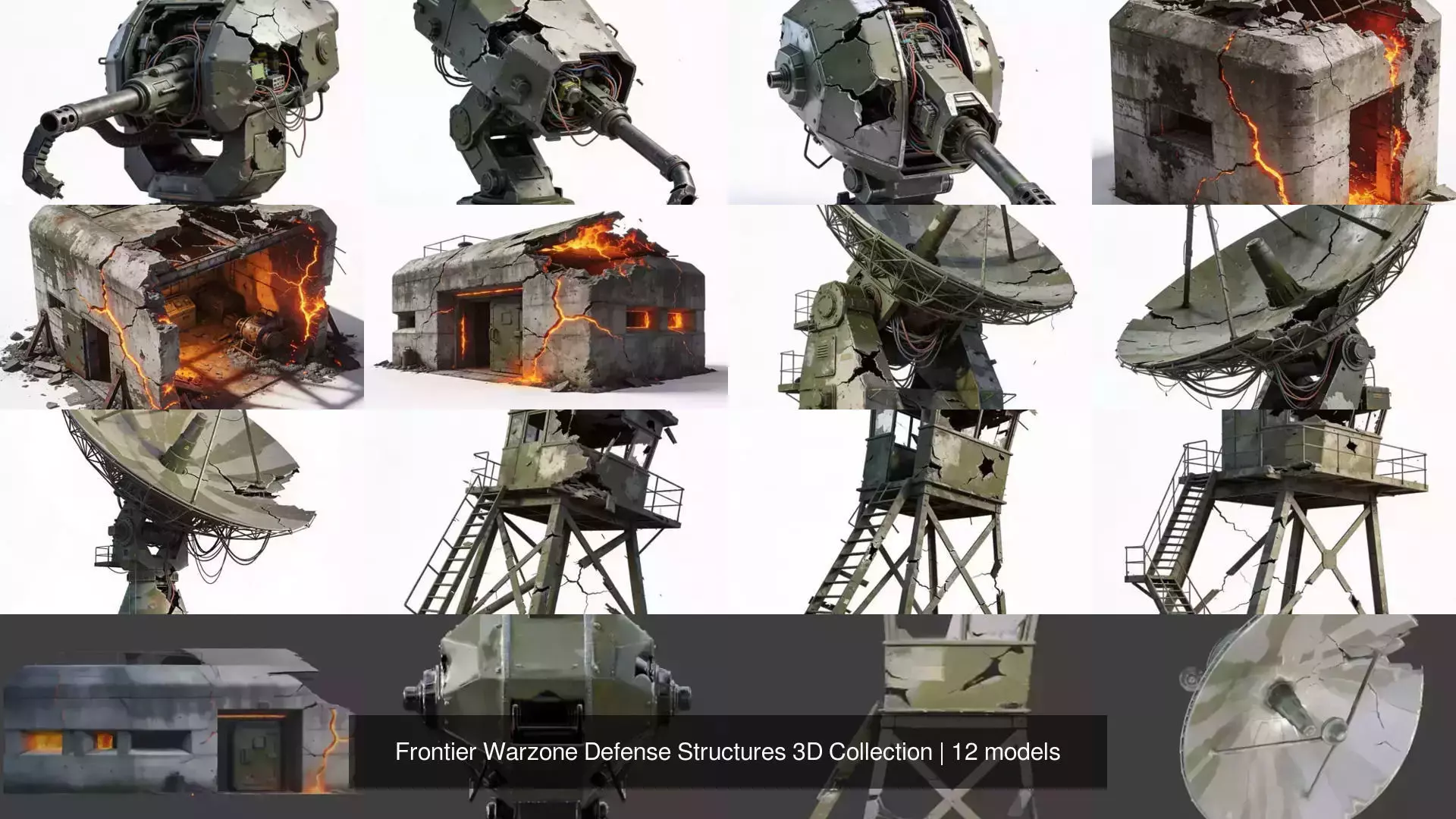 With a mix of operational radar systems and heavily damaged structures — including lava-cracked bunkers and ruined watchtowers — the collection offers strong cinematic and gameplay storytelling potential.