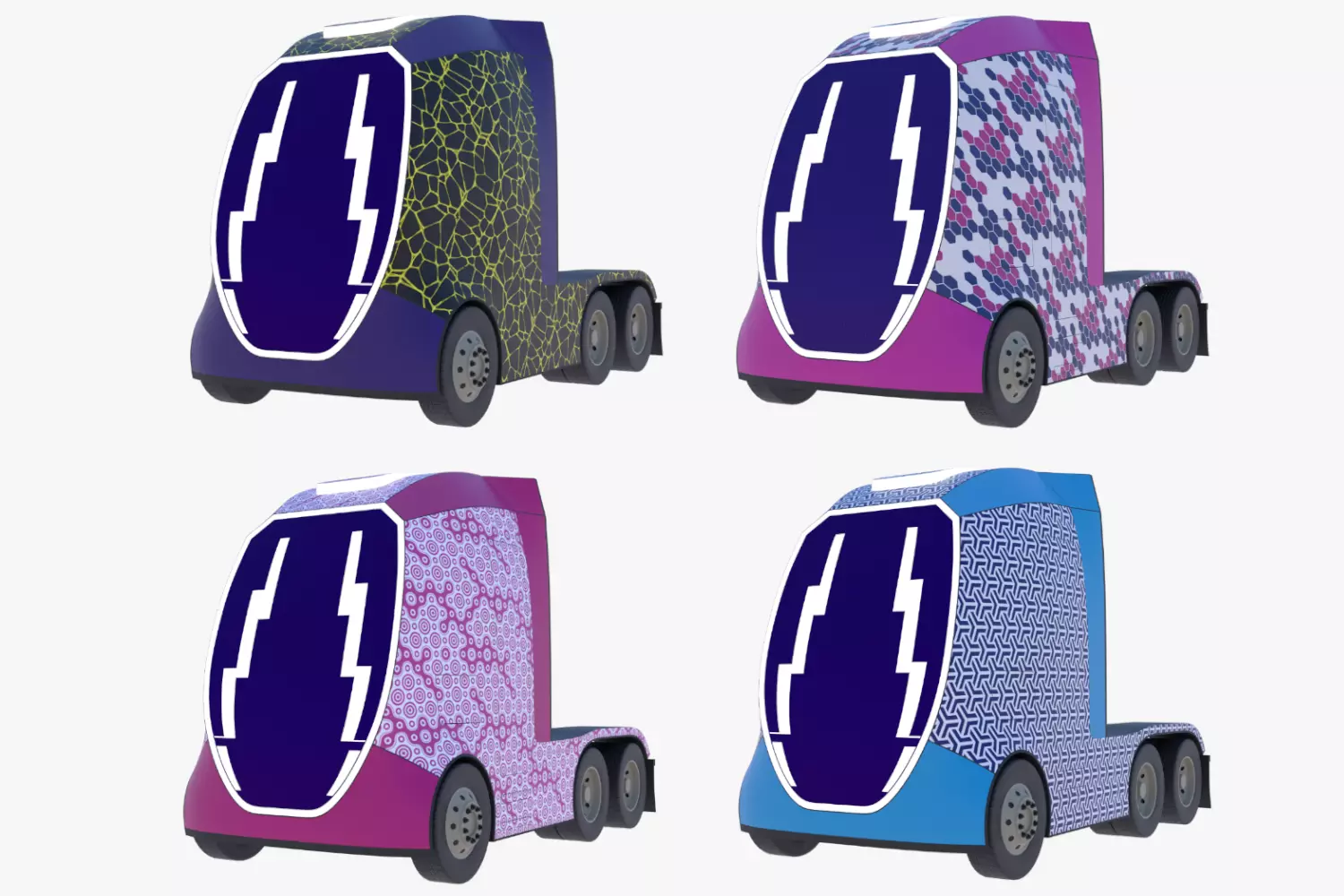 These are 3D models of futuristic semi-trucks.