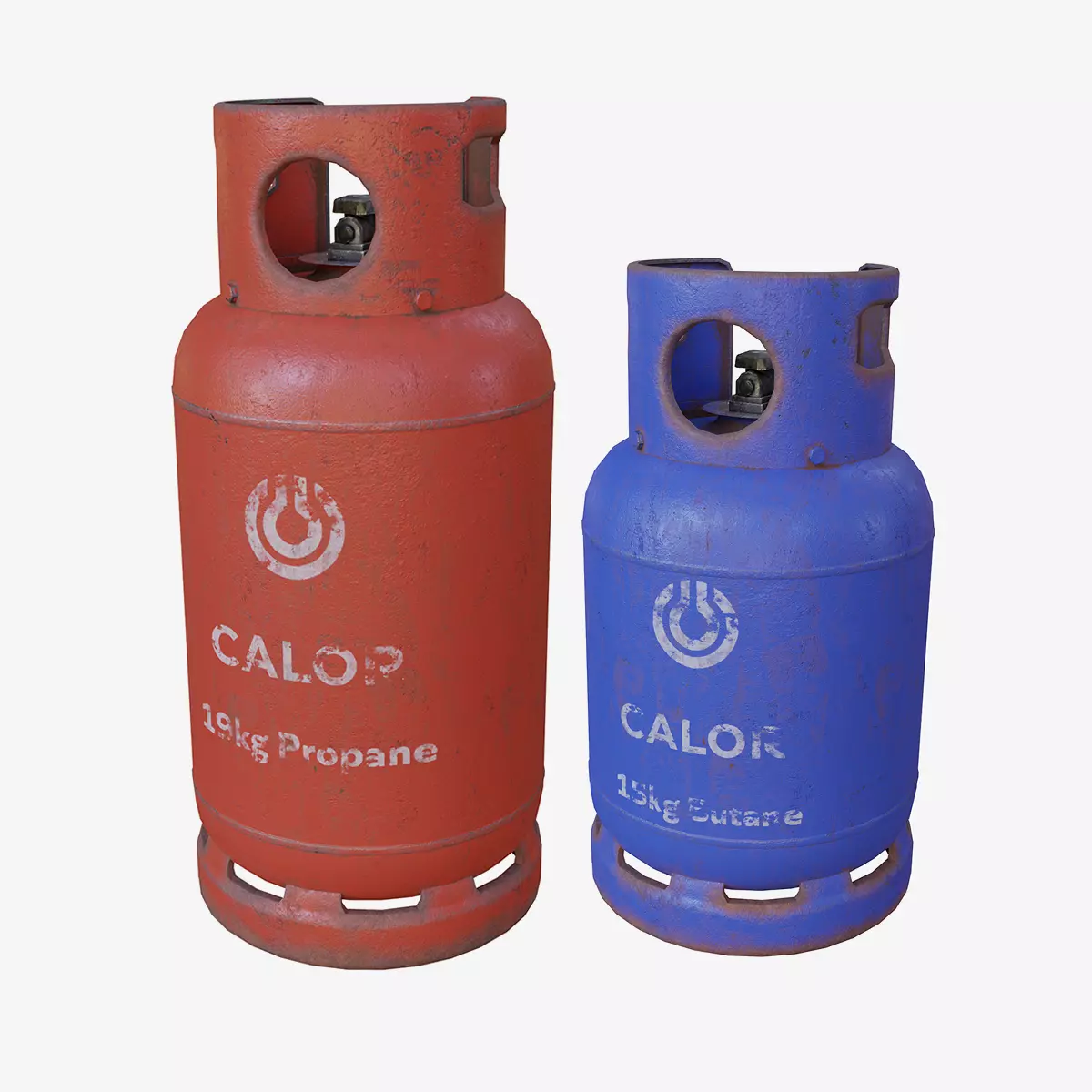 19kg Propane bottle and coresponding 15Kg Butane bottle by Calor Gas. All Hand painted textures in PBR met/rough and spec/gloss workflows.