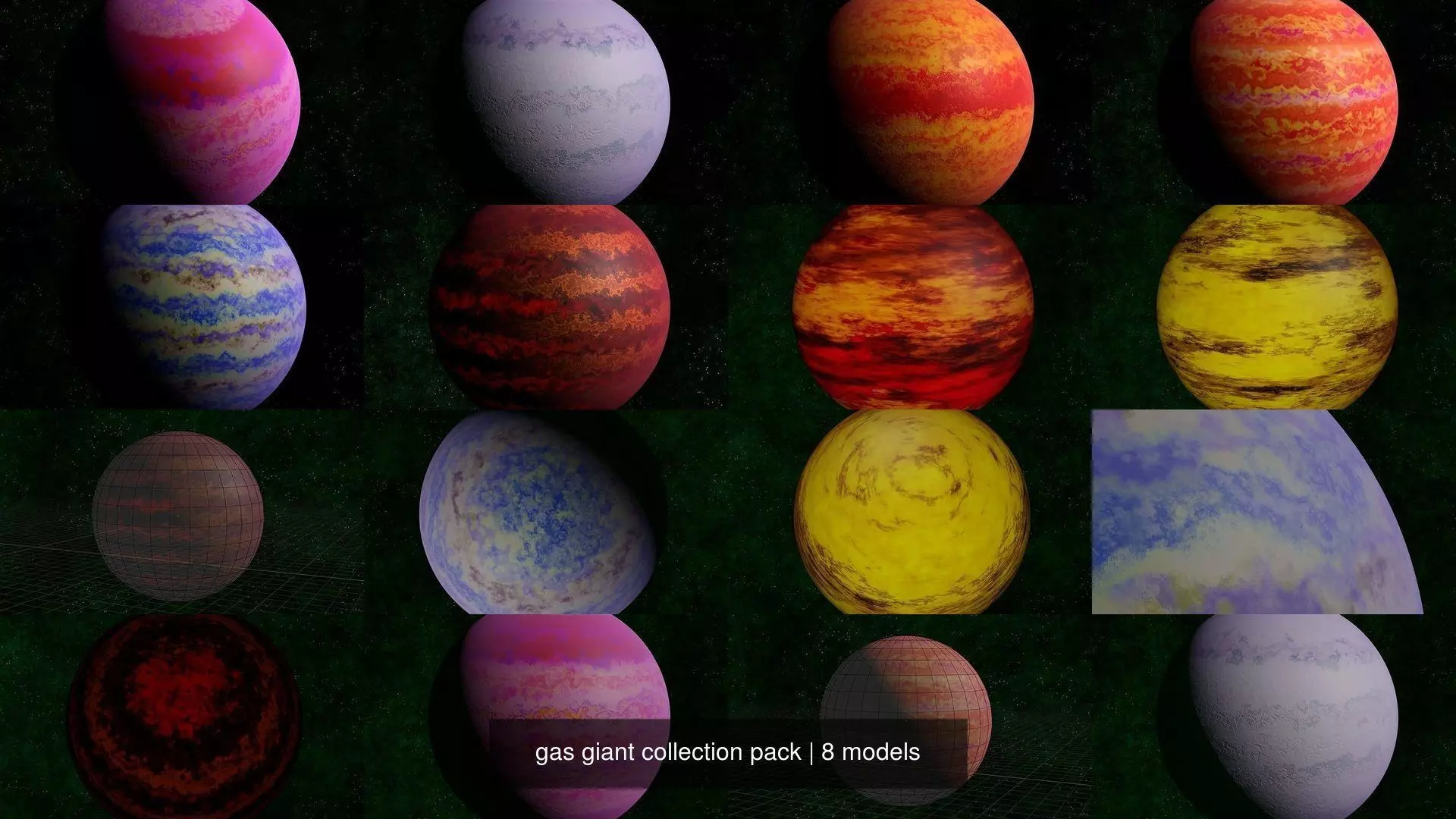 This collection contains models of realistic exoplanets like some of those gas giants one might expect to find in orbits of far away stars. Similar to our own gas planets like Jupiter or Saturn, the visible colors are created by different types of gas and substances floating in the atmosphere. Thanks to the HD textures and the low poly construction, these models can be used both as a far away background models, as well as models for close up use.