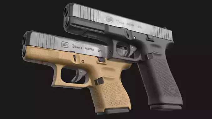 Game ready low (mid)-poly 3D models of Glock 17 + 26 / 27 Gen 5 (FBX, Maya, Blender, 3ds Max).