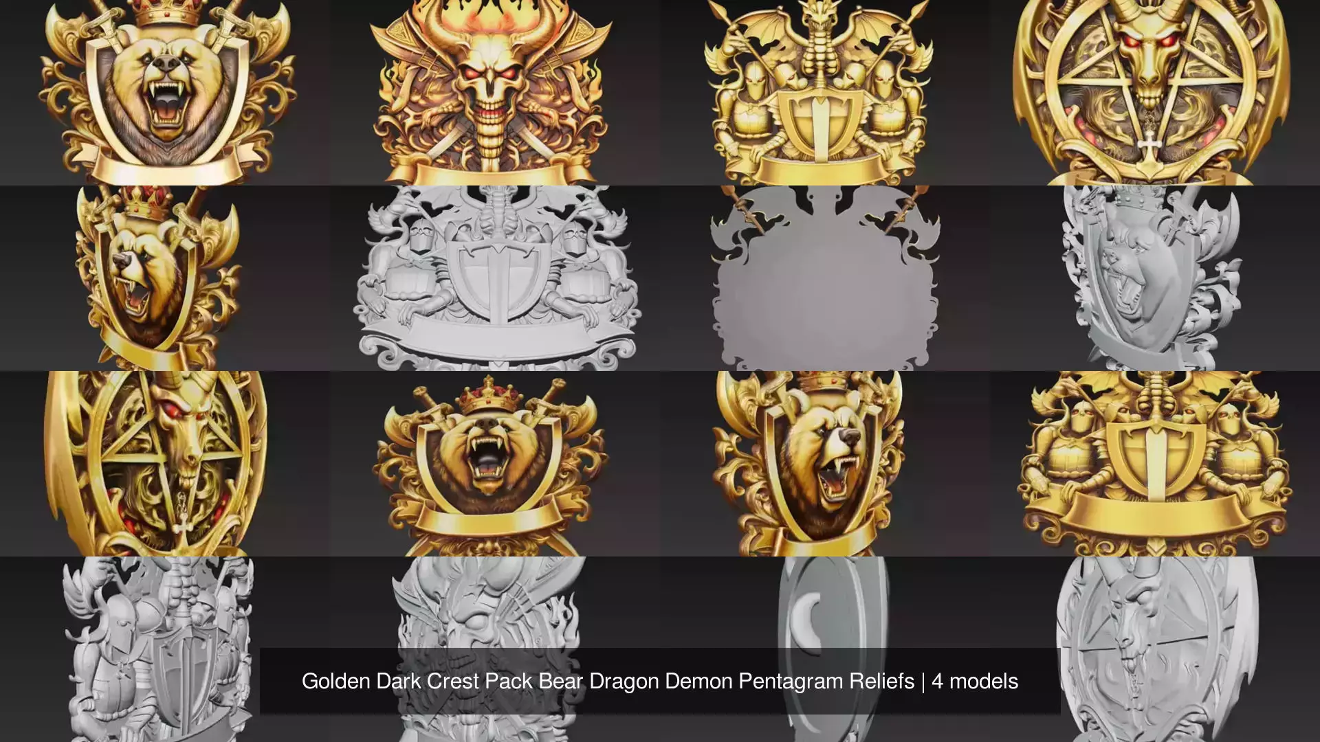 The Golden Dark Crest Pack is a high-detail fantasy wall relief collection featuring powerful heraldic symbols forged in gold-themed aesthetics. This pack combines beast dominance, demonic iconography, and medieval crest design into a unified dark fantasy emblem set.