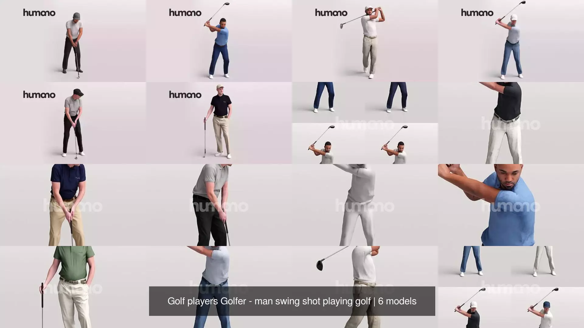 5 Most popular models of golf players. Naturally looking 3d posed model with high quality mesh and textures. Each model comes with realistic blend material (100k), optimized simple material (30K) and 4 different color variations.