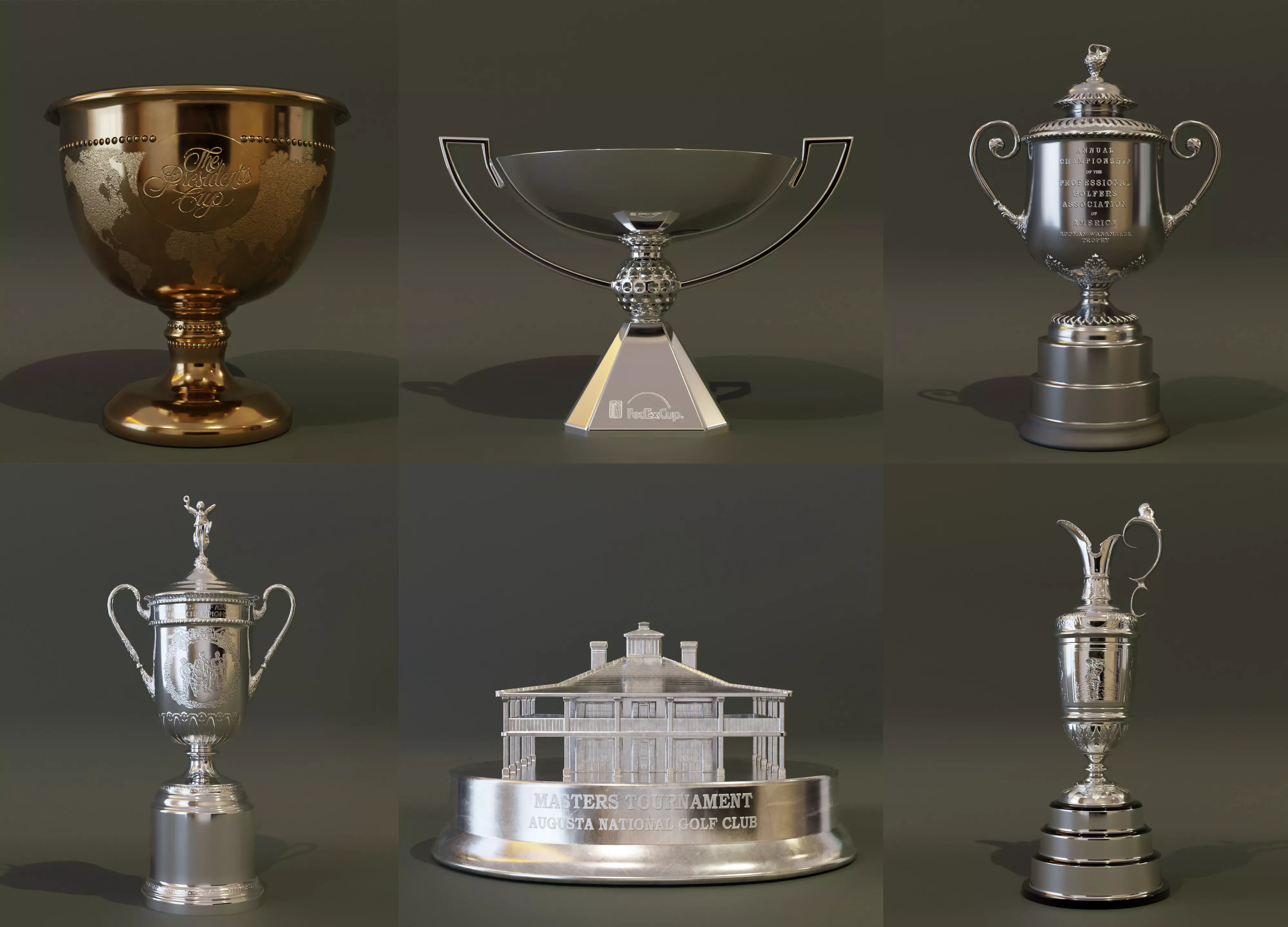 Collection of trophies from major tournaments in the PGA Championship - Augusta Masters, British Open (Claret Jug), US Open, PGA Championship (Wanamaker Trophy), Presidents Cup