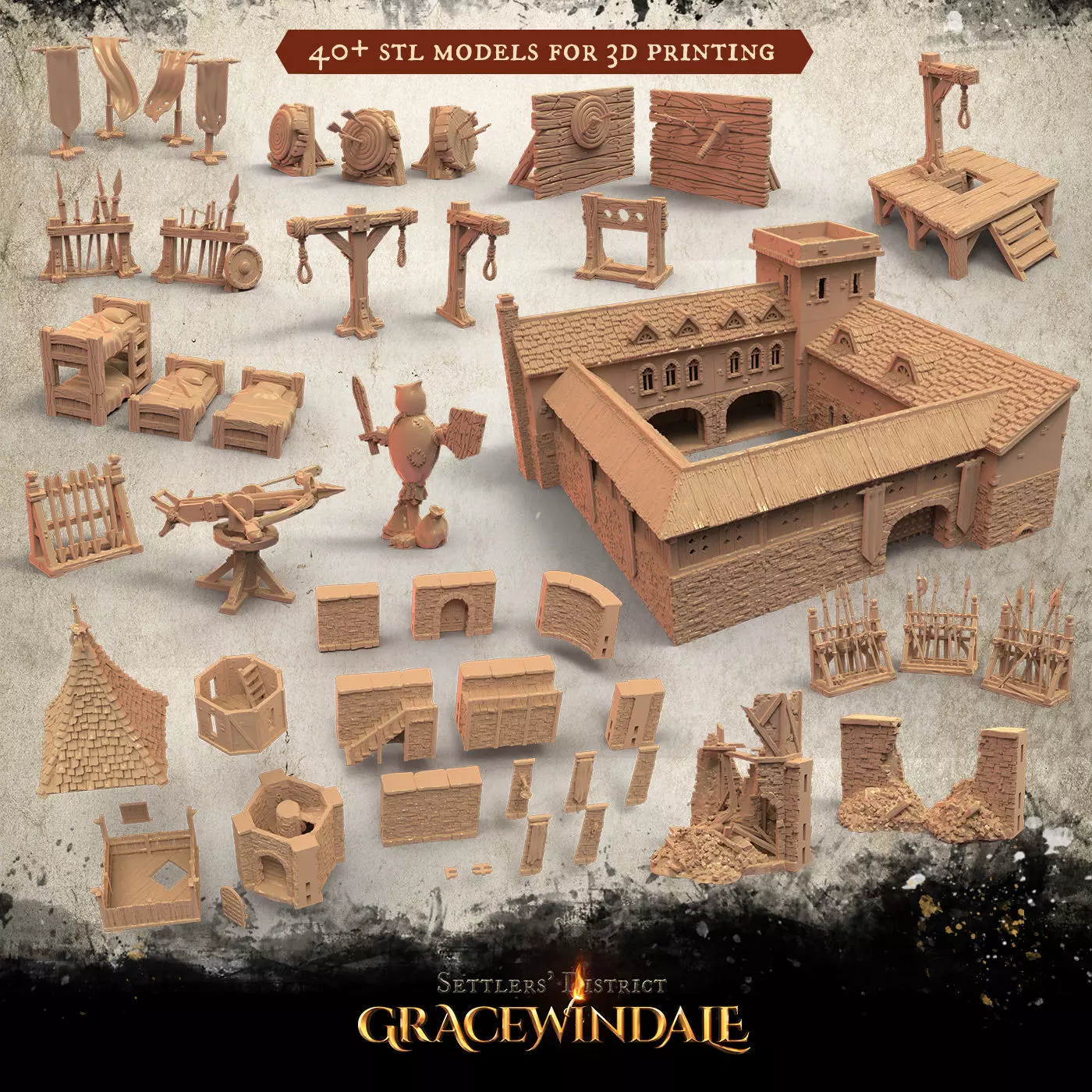 The collection includes: modular town walls (Openlock compatible), modular barracks/fort/castle, weapon racks, ballistas, target practice, and banners.