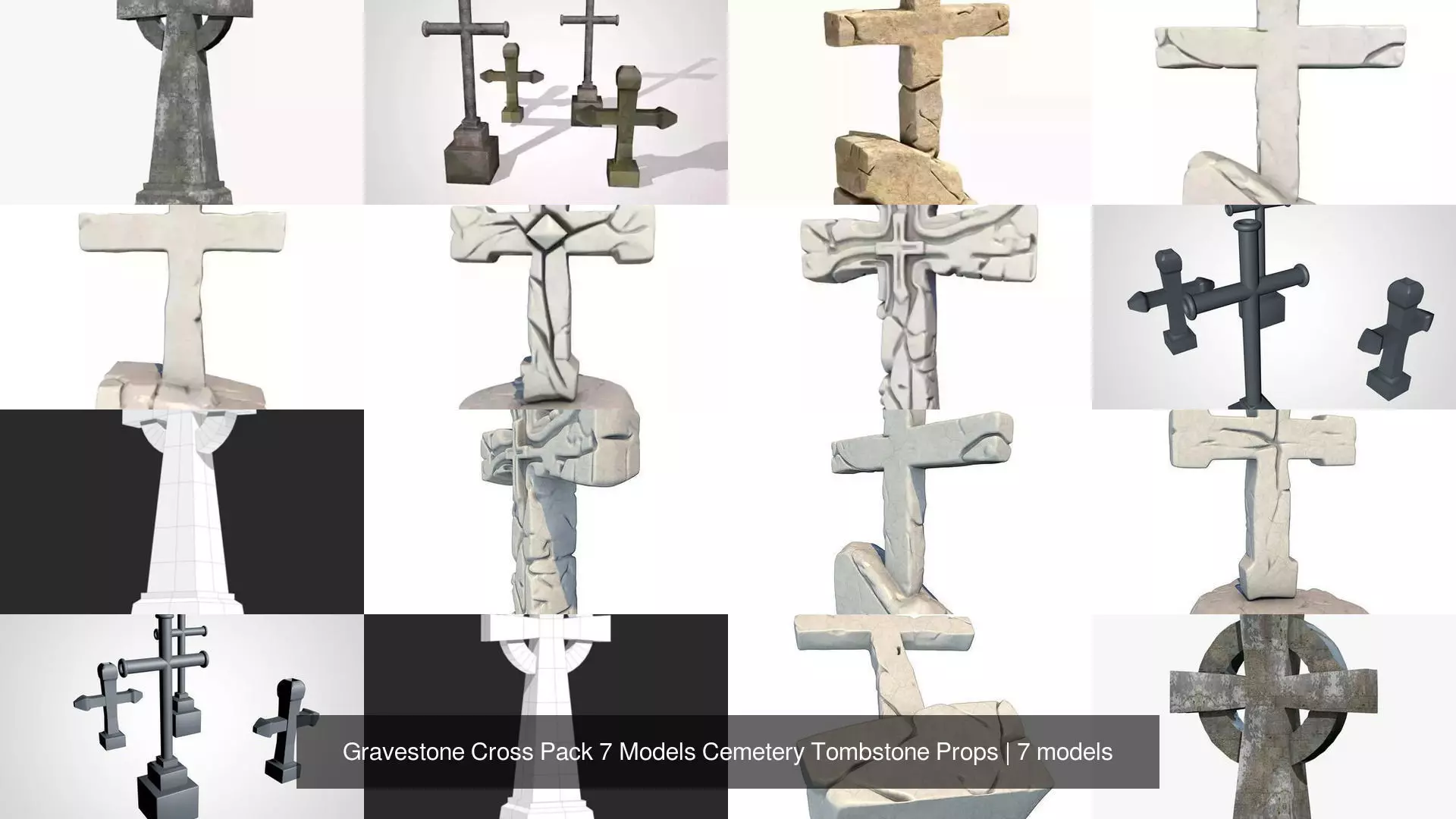 This pack includes 7 detailed cemetery gravestone cross models, perfect for creating realistic or stylized graveyard scenes.