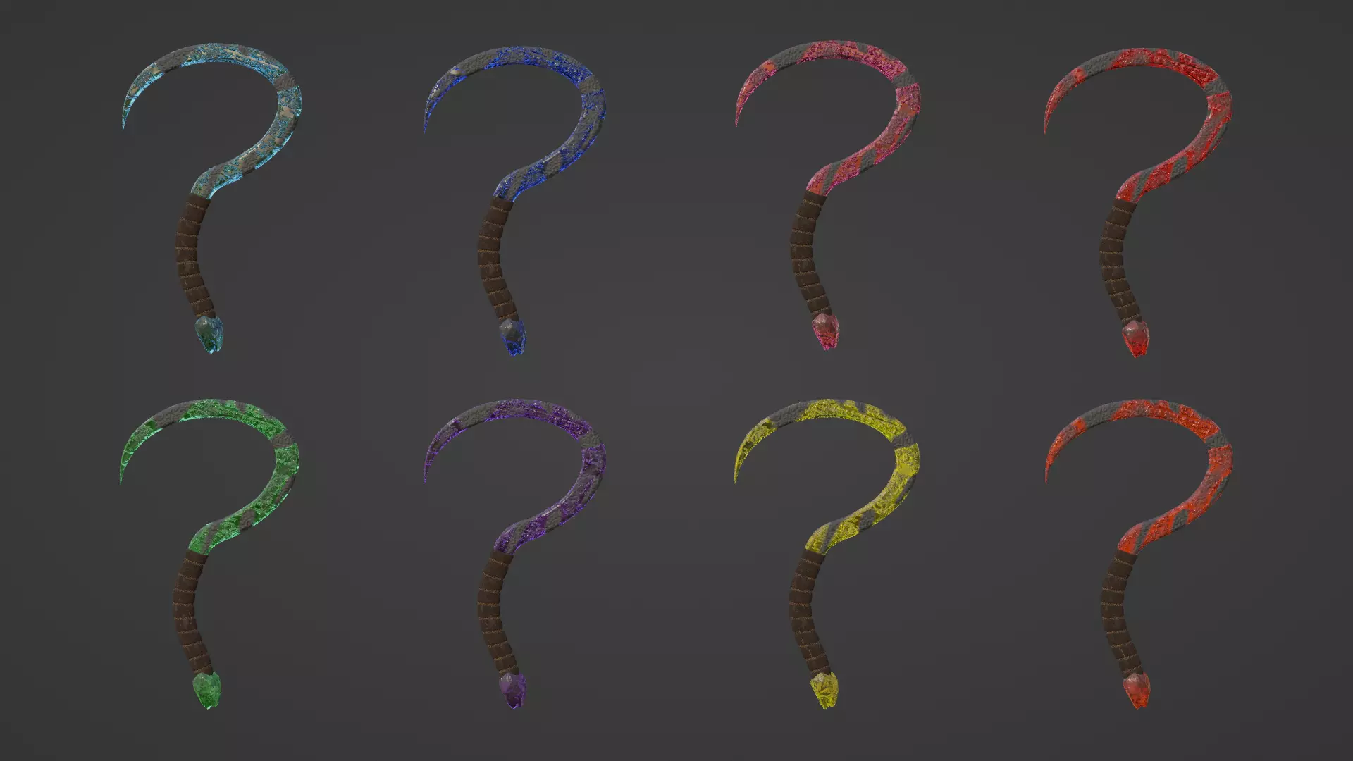 The design isn't something unique with the exeption of the gem mixed with stone texture. These models were created in a way to make them look like it's a sickle with different gems. Preview images were rendered with Blender Eevee.