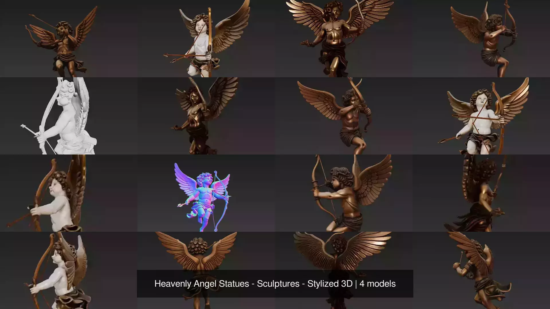 From warrior angels holding bows to serene guardians with symbolic gestures, this collection provides versatile options for CGI, display sculptures, and 3D printing.