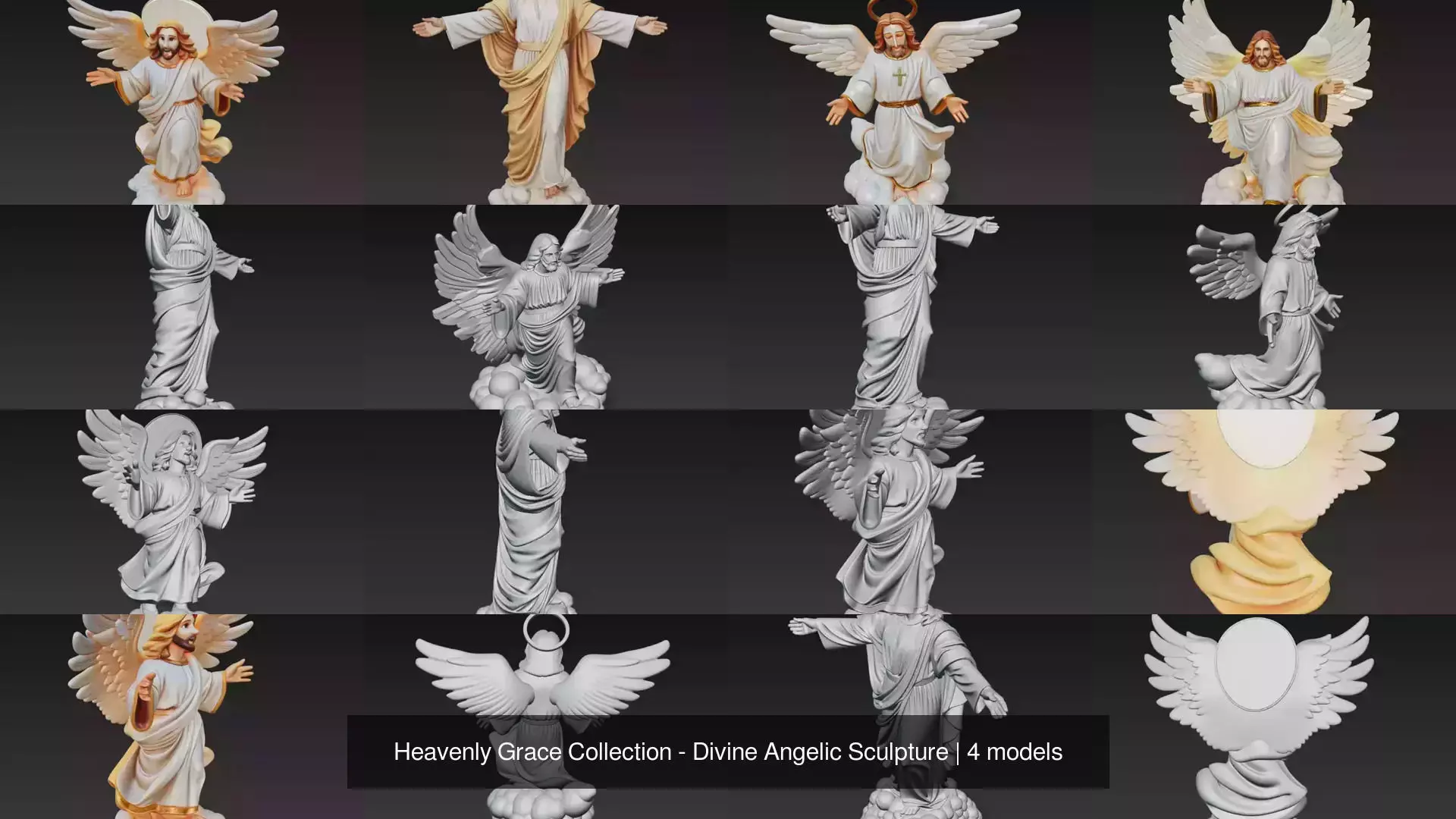 Each piece is sculpted in high-resolution, with refined robe folds, detailed wings, and symbolic gestures of divinity and peace.