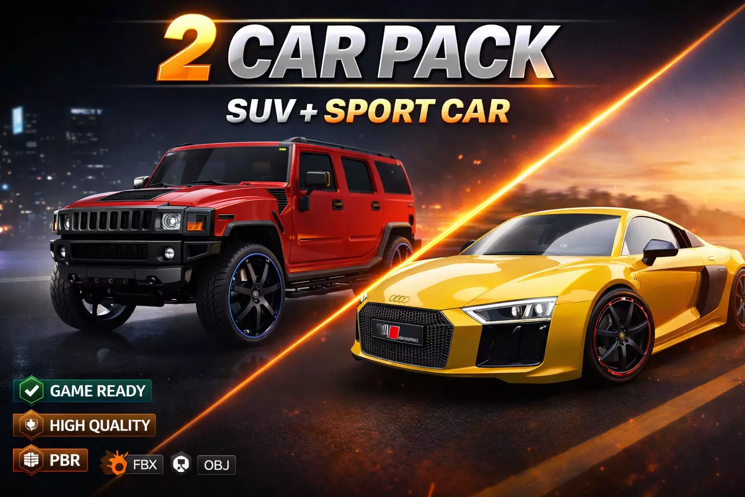Upgrade your project with this premium 2 Car Pack, featuring a powerful SUV and a sleek high-performance sports car. Perfect for games, cinematics, simulations, and real-time applications.