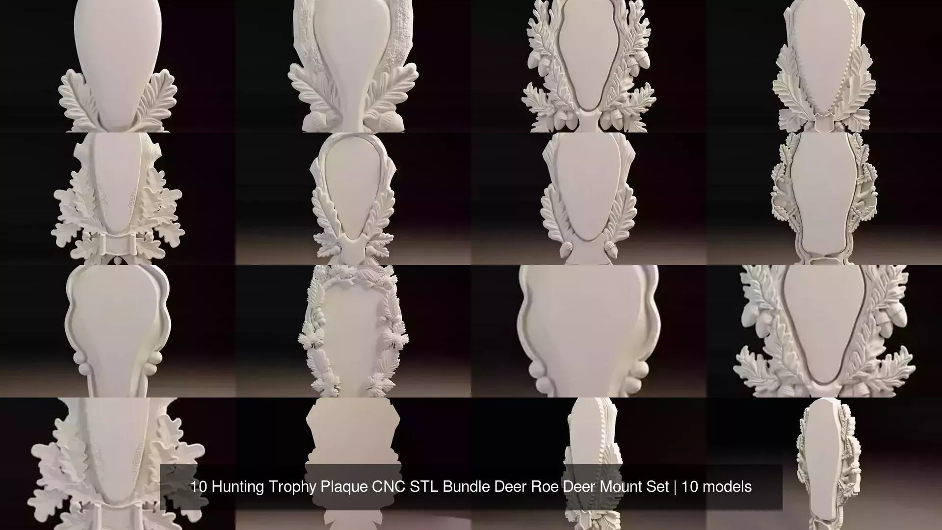 This bundle includes ten ornamental plaque designs suitable for mounting deer, roe deer and similar hunting trophies. The collection features classic European hunting style decorations with oak leaves, ornaments and traditional trophy board shapes commonly used in taxidermy.
