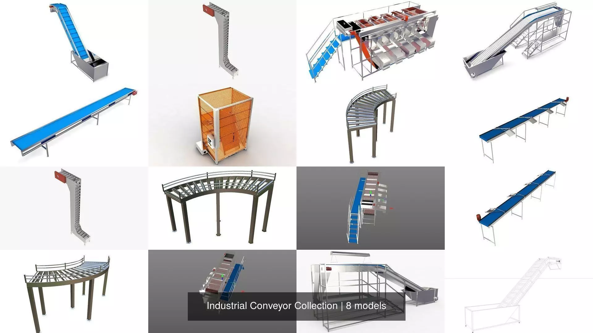 Contains Conveyors, elevators used in food processing lines.Clean geometry with proper heirarchy. UV mapped and applied materails.