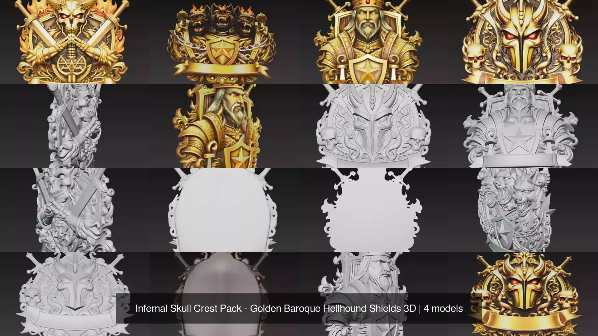 All models are sculpted in high resolution with deep relief depth, sharp engravings, layered armor elements, and strong silhouette balance. Gold baroque ornaments, horns, skull anatomy, weapons, and flame motifs are carefully detailed to maintain visual impact both up close and from distance.