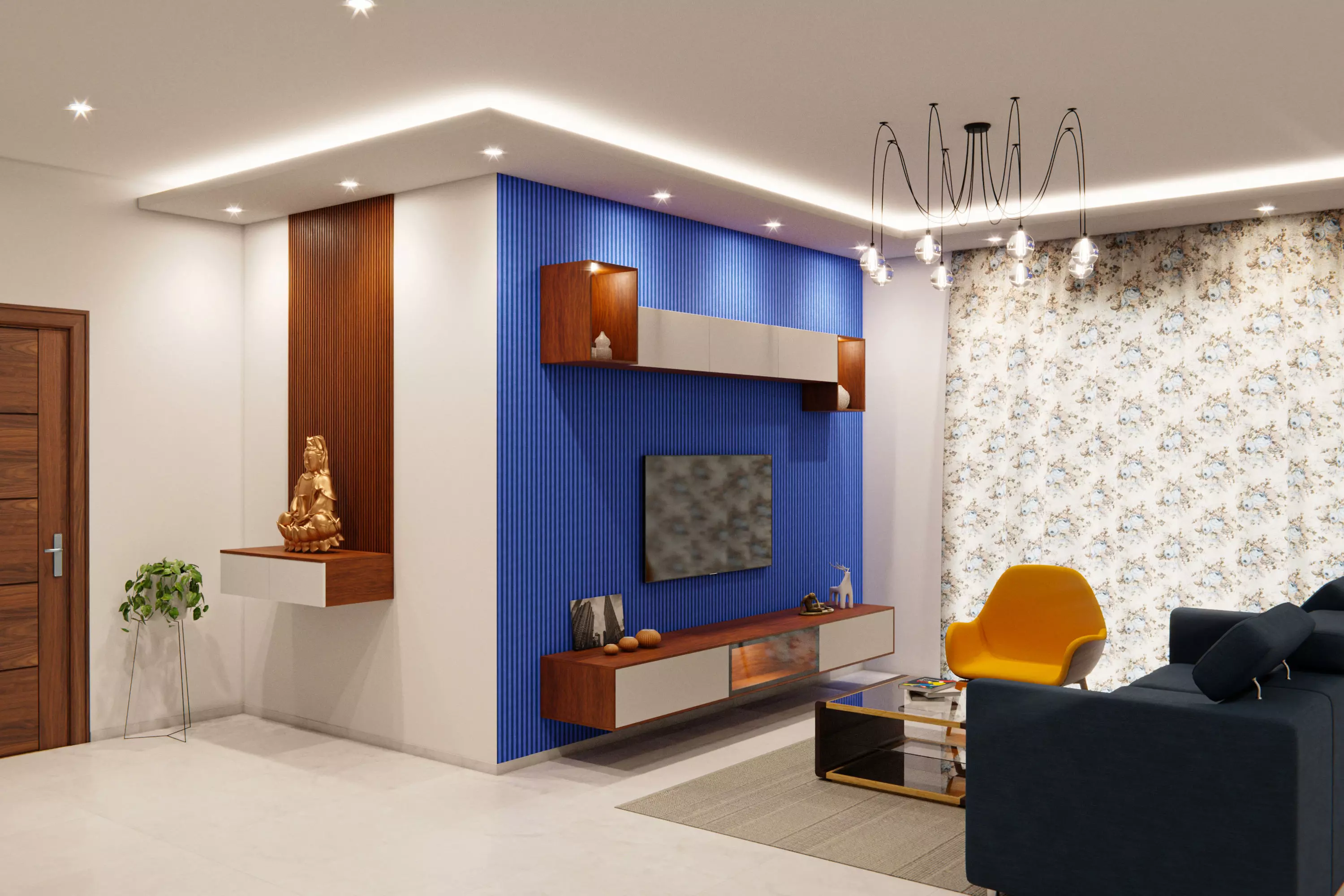 The collection has all the furniture, which is made of high quality materials and has a modern design. The collection includes a black ceiling lamp with an unusual design that is ideal for living rooms, a dark-blue sofa made of soft, easy-to-clean material, a wooden TV unit that has been treated and varnished and can hold a TV or other room decoration.