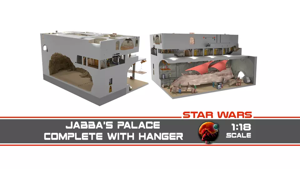 This 3D printable set creates the compete Jabba's Palace from Star Wars Return of the Jedi and the Book of Boba Fett. It recreates the complete Trophy Room, including the hanger, boiler room and cell blocks.This is a very big set, with 10 large sets combined. 1:18 scale (3.75 inch figures)