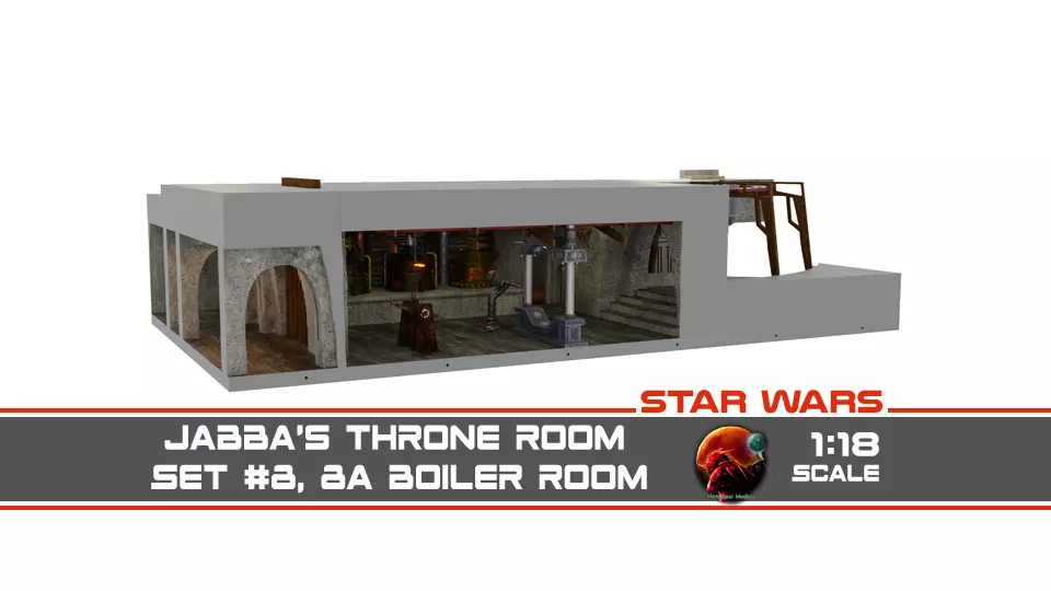 This 3D printable set creates the compete film set from Star Wars Jabba's Throne Room from Return of the Jedi. It recreates the complete Palace.1:18 scale (3,75 inch figures)
