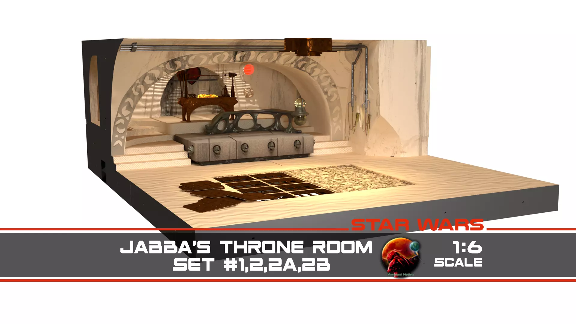 This 3D printable set creates the compete film set from Star Wars Jabba's Throne Room from Return of the Jedi. It recreates the complete Throne room. 1:6 scale (12 inch figures)