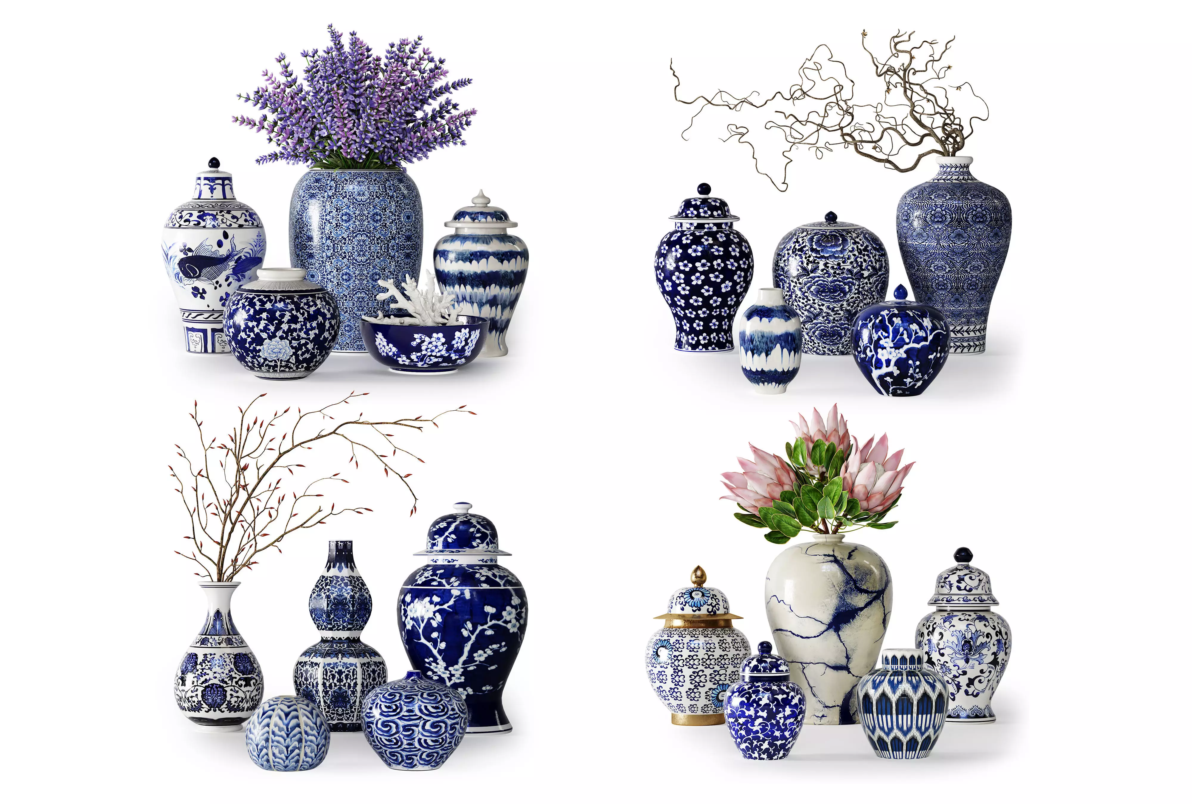 Chinese Ginger JarsThis collection contains 4 files with 20 vases with flowers composition in blue and white colors in chinese styleIn total there are 20 different hi-quality jinjer jars of differnt shapes and ornamentsAll models are made in 3ds max and compatible with Corona render and V-RayThere are also FBX and OBJ filesIf you have any issues, just ask me!