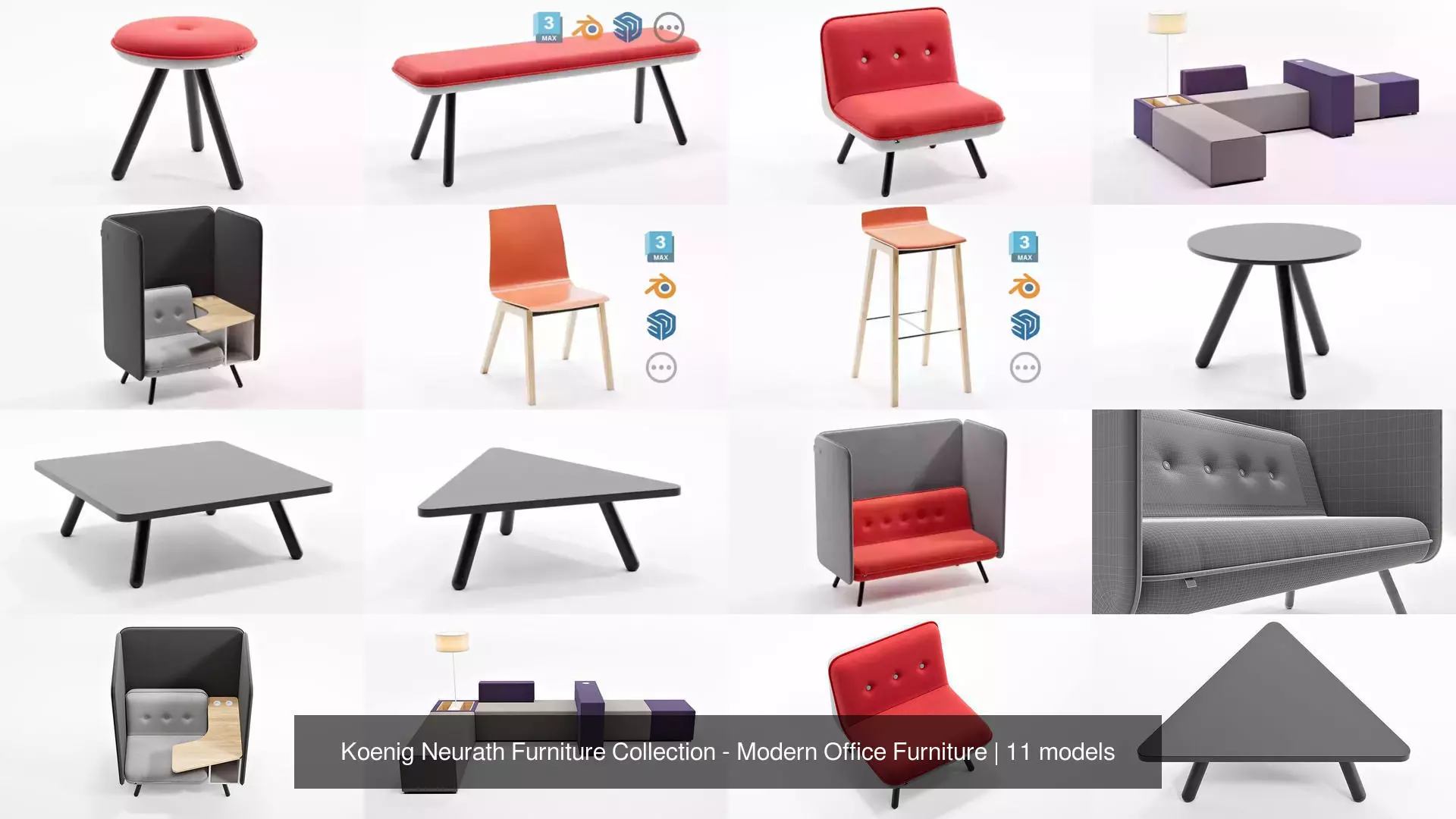 Furnitures from Koenig+Neurath.Including chairs, stools, tables, bench, sofas.
