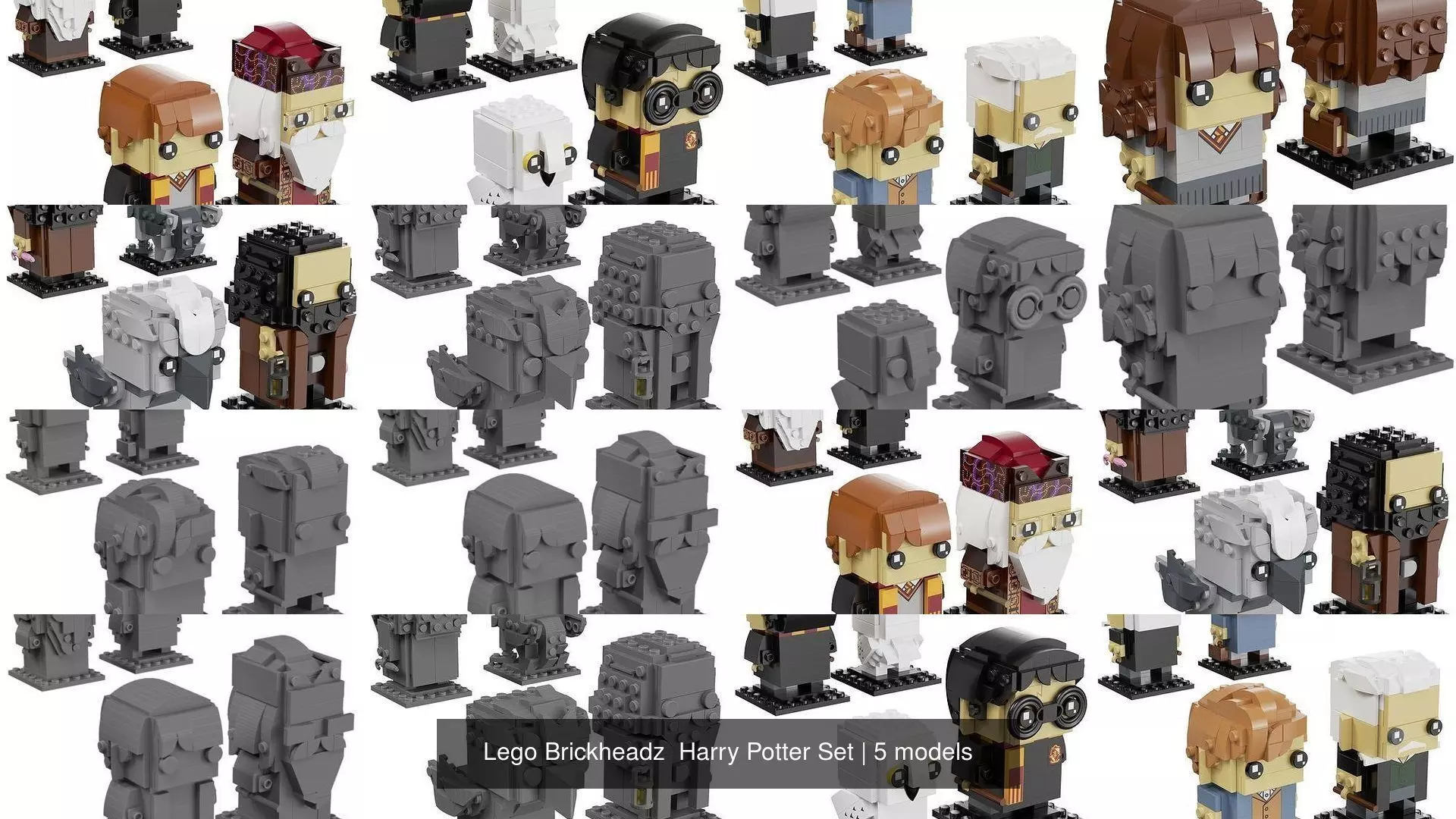 This collectible LEGO BrickHeadz set included 41615: Harry Potter & Hedwig,41621: Ron Weasley & Albus Dumbledore,41616: Hermione Granger,41631: Newt Scamander & Gellert Grindelwald and 40412: Hagrid & Buckbeak.