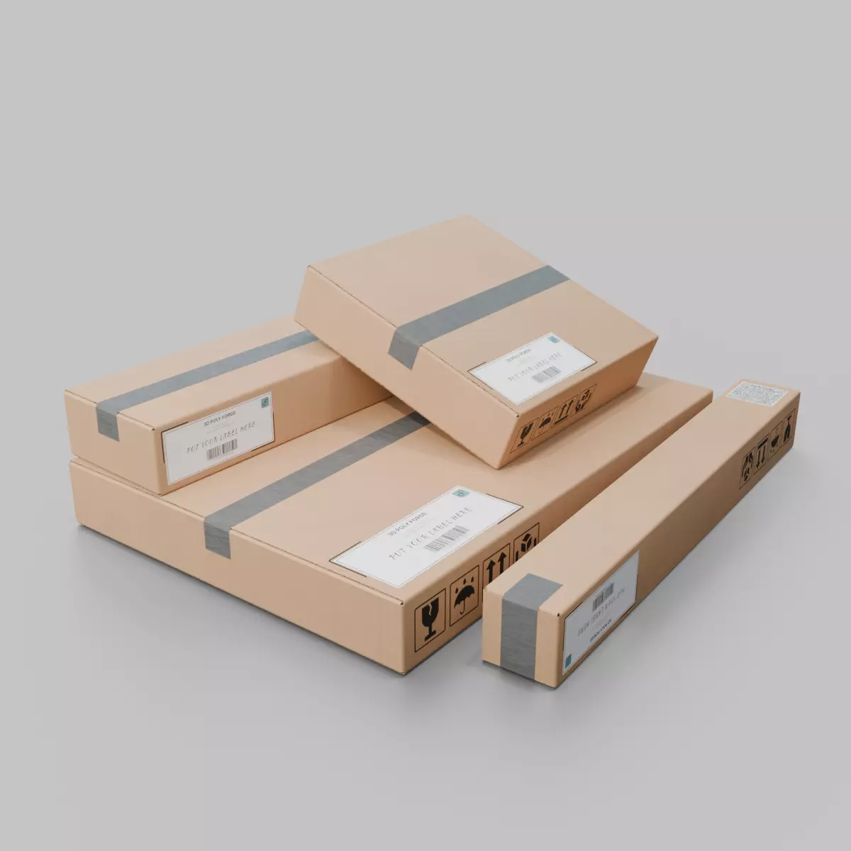 A highly detailed and customizable 3D cardboard box model set, it offers four different sizes and dimensions that help you in your project (cube flat box, cube tall narrow box, rectangular long flat box, rectangular flat box), designed for use in packaging design, product visualization, and shipping simulations.