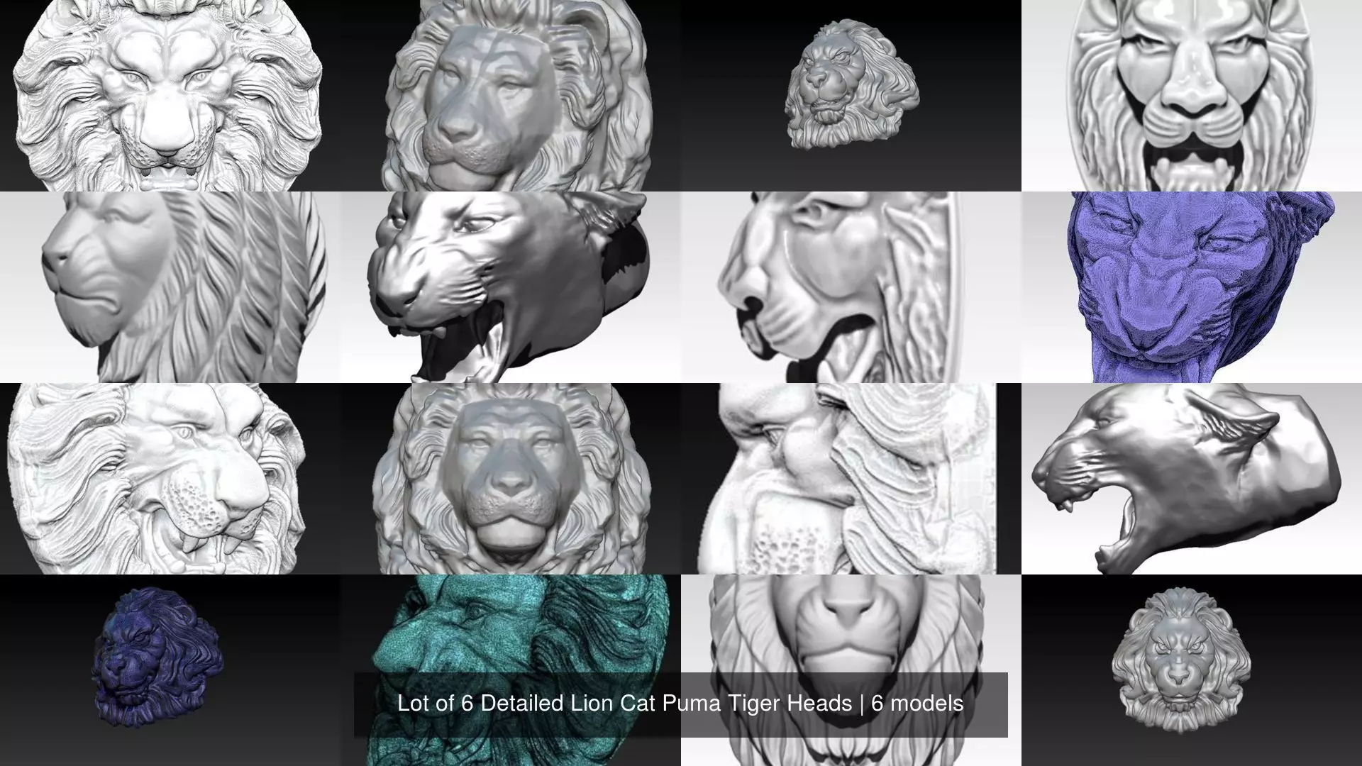 Lot of 6 Detailed Lion Cat Puma Tiger Heads 3D Model Pack