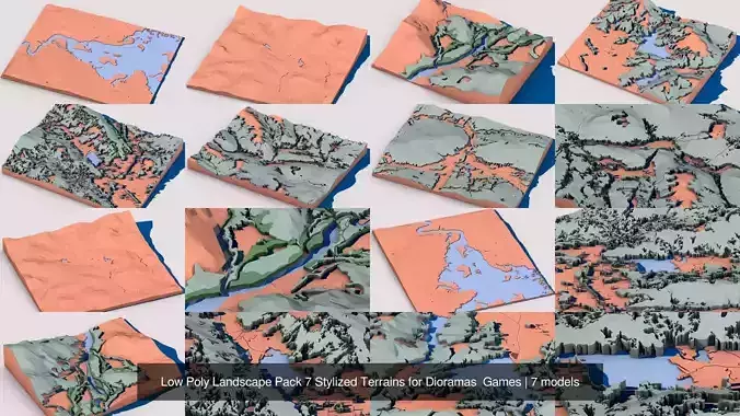 This pack includes 7 unique low poly landscape models, designed for versatility and visual impact.Perfect for 3D printing, dioramas, board games, game environments, or architectural and concept visualization.