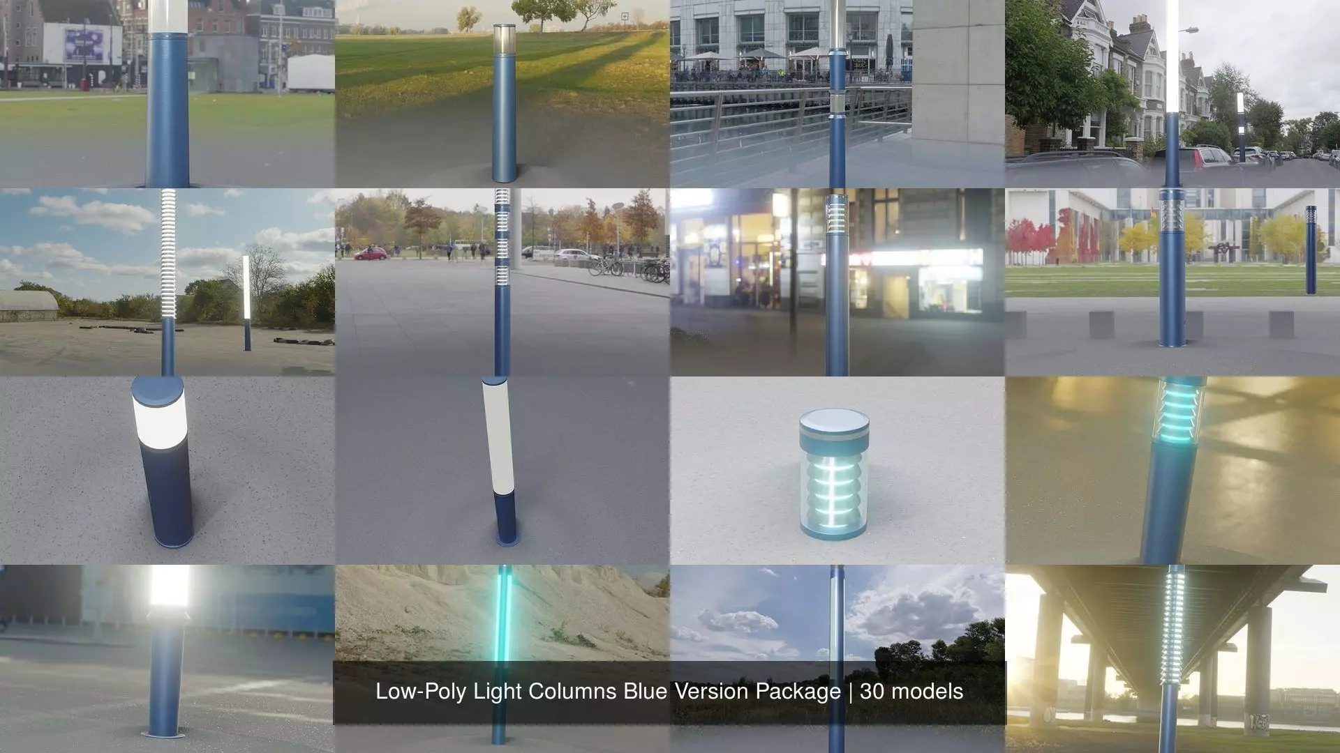 Here are 30 different types of low-poly light columns. The blue textured Version!