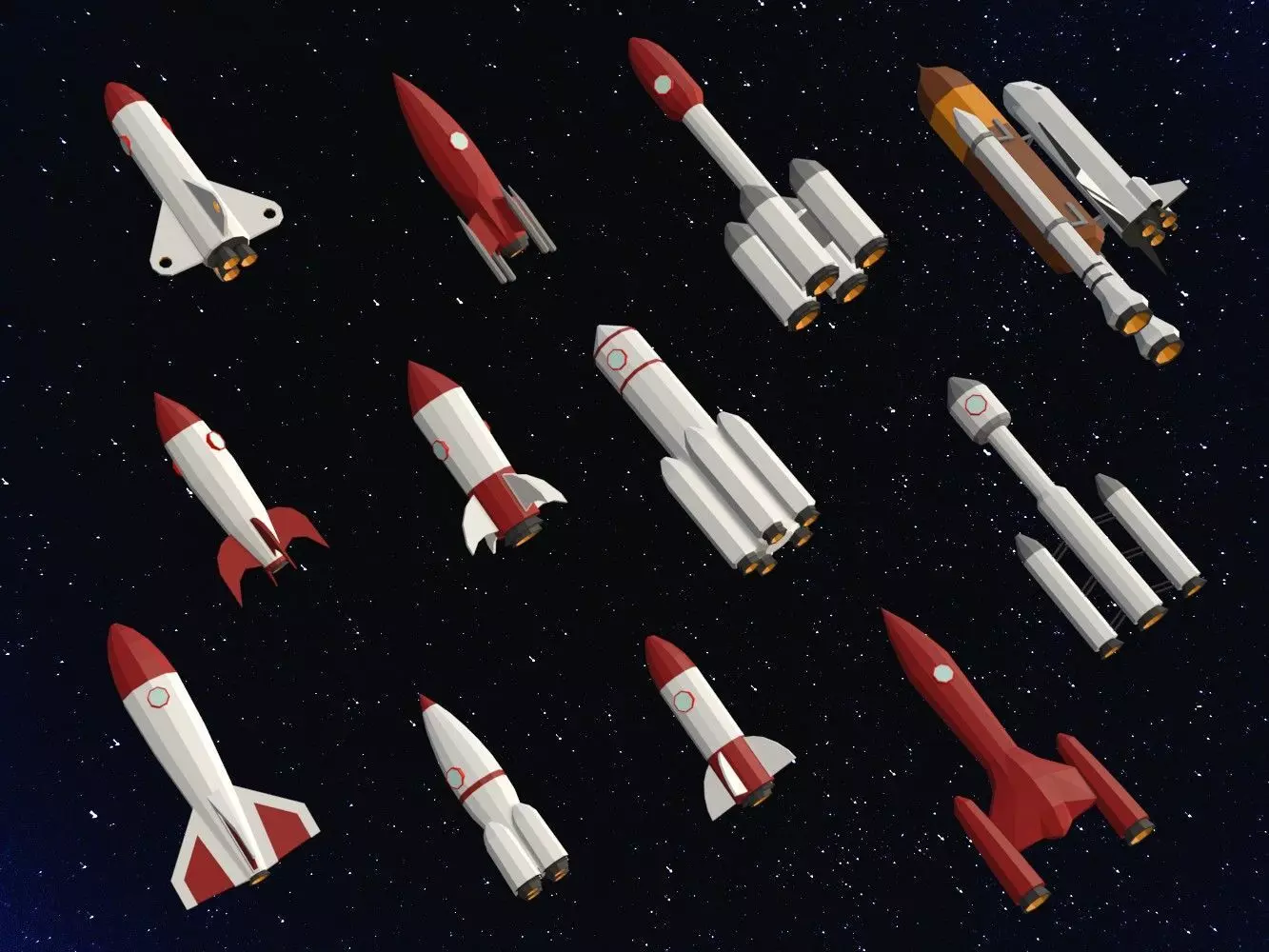 A collection of 12 low-poly rockets.