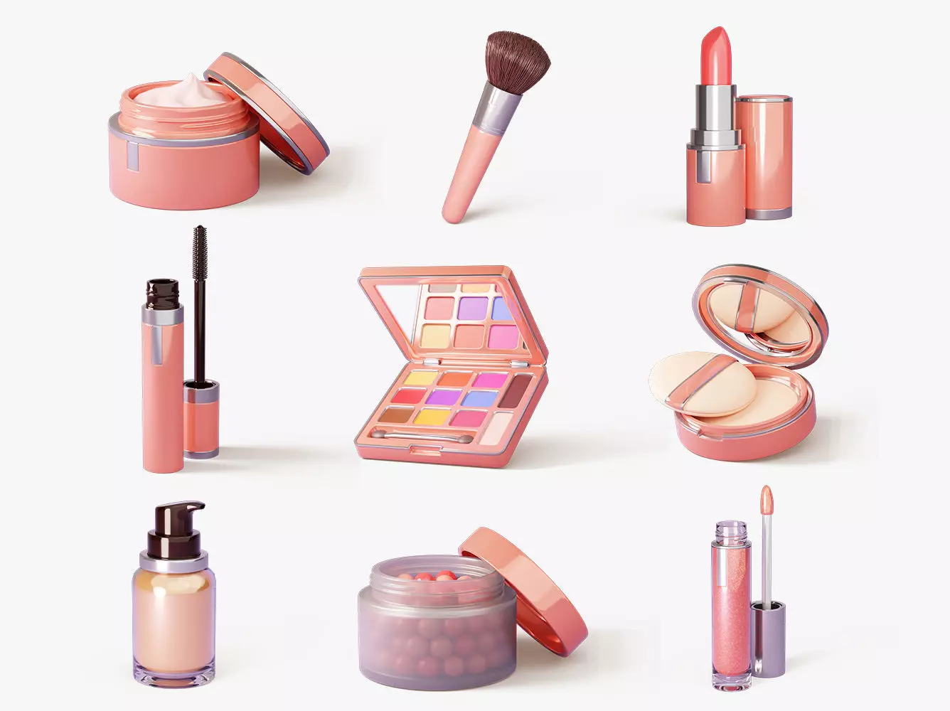 A cohesive set of stylized cosmetics in a soft coral theme: face cream jar, powder brush, lipstick, mascara tube, eyeshadow palette with applicator, compact powder with mirror and puff, pump-top foundation bottle, blush pearls jar, and lip gloss. Clean studio renders on white make the pack ideal for beauty branding, ecommerce banners, app UI, packaging mockups, tutorials, and promos where a cute, modern look is needed.