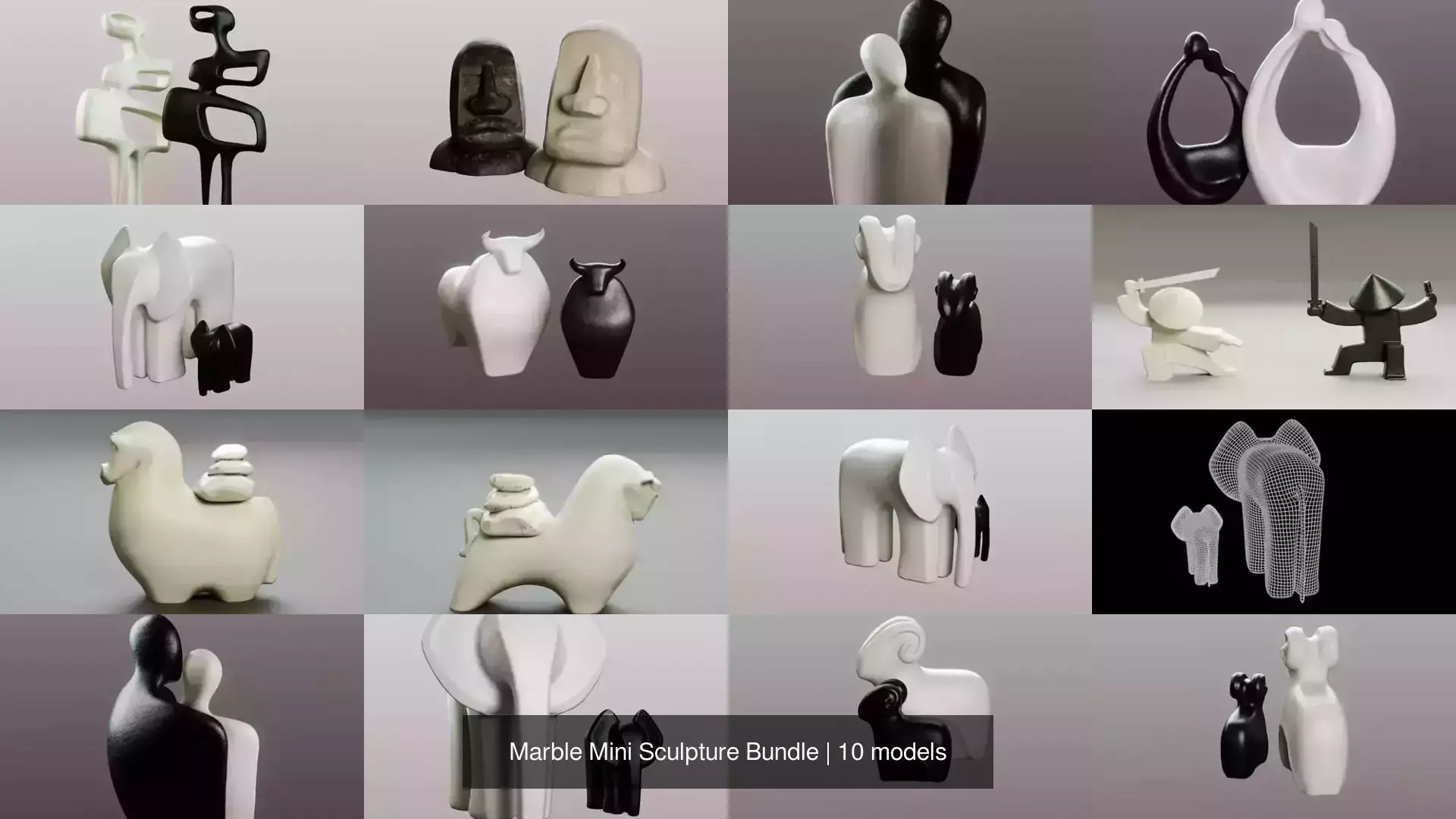 This premium bundle features a collection of 10 handcrafted 3D miniature figurines inspired by contemporary sculptural art. Each model was carefully designed to capture the elegance and visual weight of carved marble and stone, making them ideal accents for architectural visualization or interior décor renders.