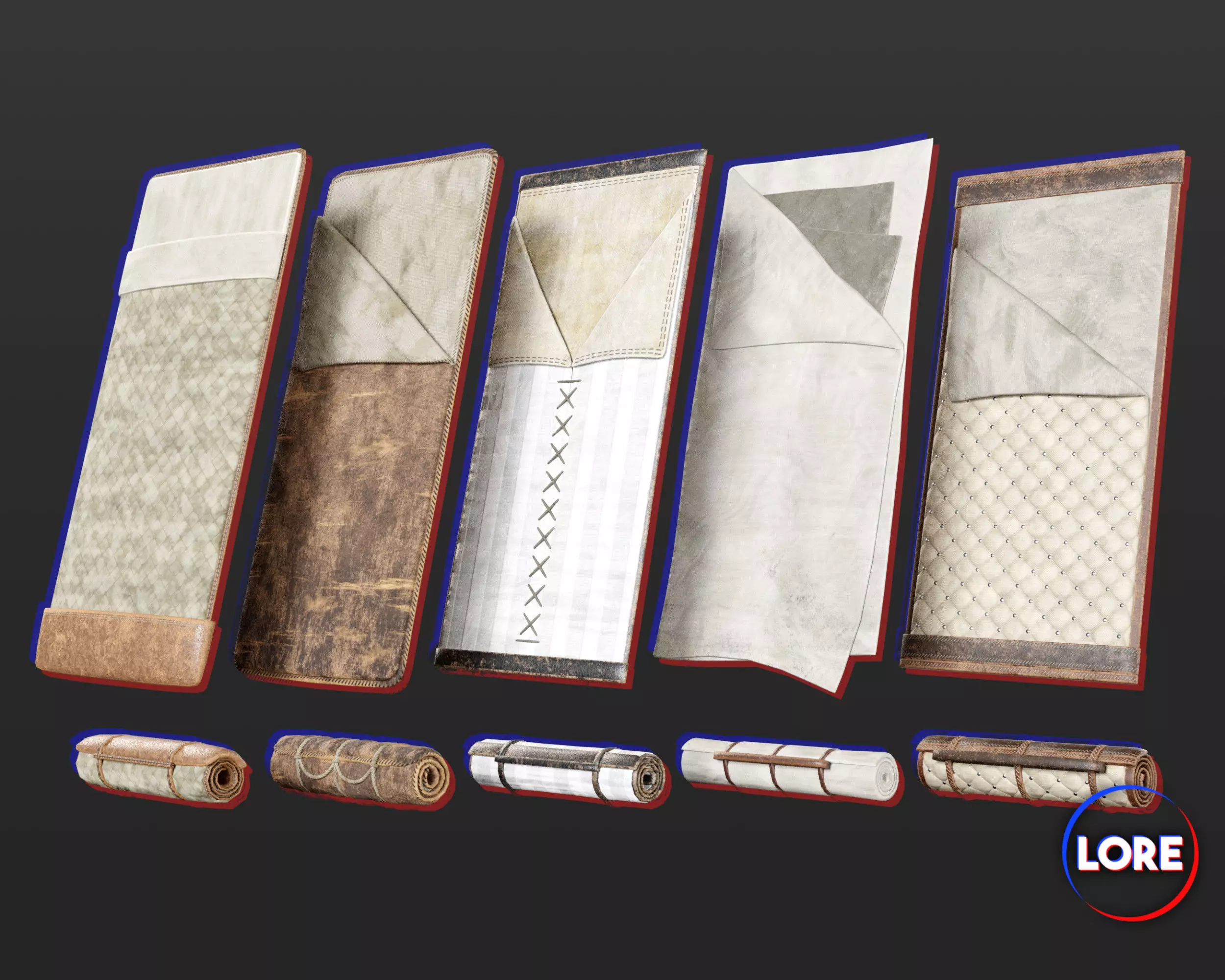 This Collection offers 5 unique Bedrolls. Includes the Crude, Common, Knightly, Elegant, and Noble Style bedrolls, flat and rolled up. These models can be purchased separately. These models may be included in other collections for a different price.
