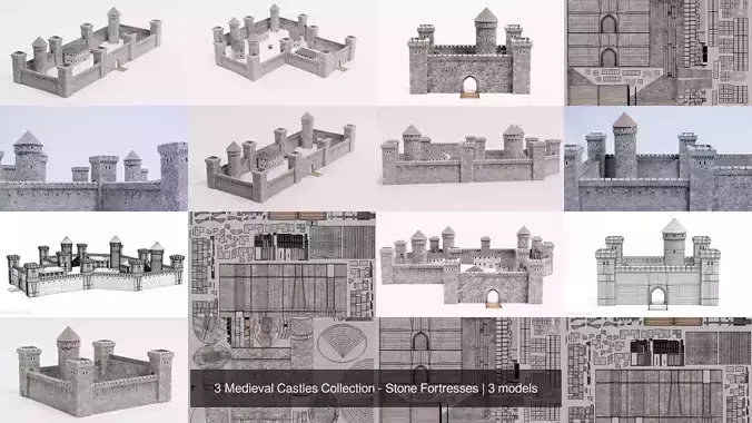 A compact collection of three medieval castle environments built around solid stone architecture and historically grounded forms. Each castle presents a distinct exterior layout with variations in walls, towers, and defensive structures, while maintaining a unified visual language across the set. The environments draw from real-world references and traditional fortress construction, offering believable scale, material presence, and spatial clarity for exterior scenes.