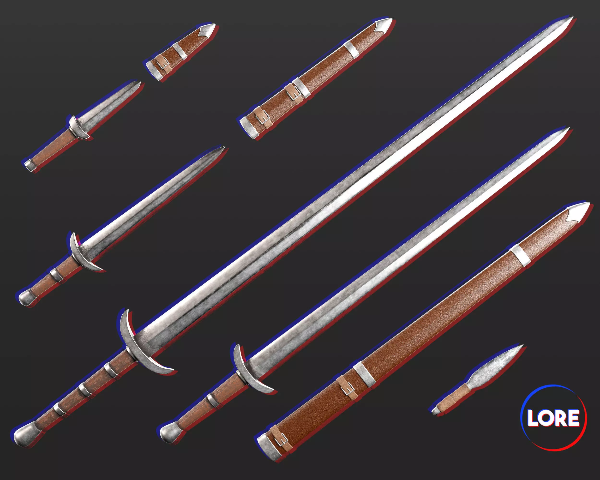 - Dagger + Sheath, Knife + Cover, Long Sword, Short Sword + Scabbard, and Throwing Knife.