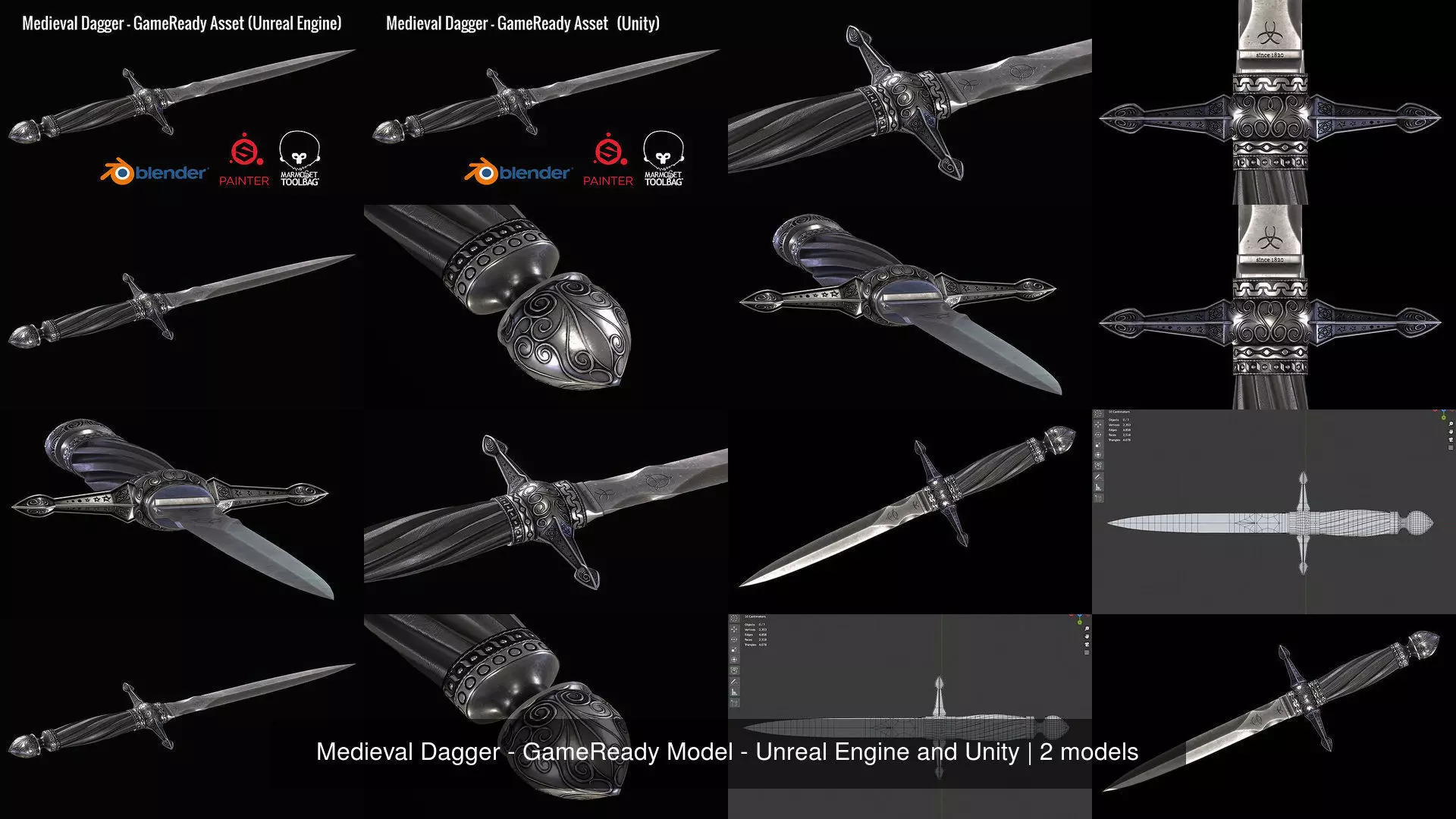HiWelcome into my Profile. and about this product specifically (Medieval Dagger) for Unreal Engine and Unity, Modelled and Unwrapped on Blender then Baked on Marmoset Toolbag and Textured on Substance Painter and at last Render, Light on Marmoset.
