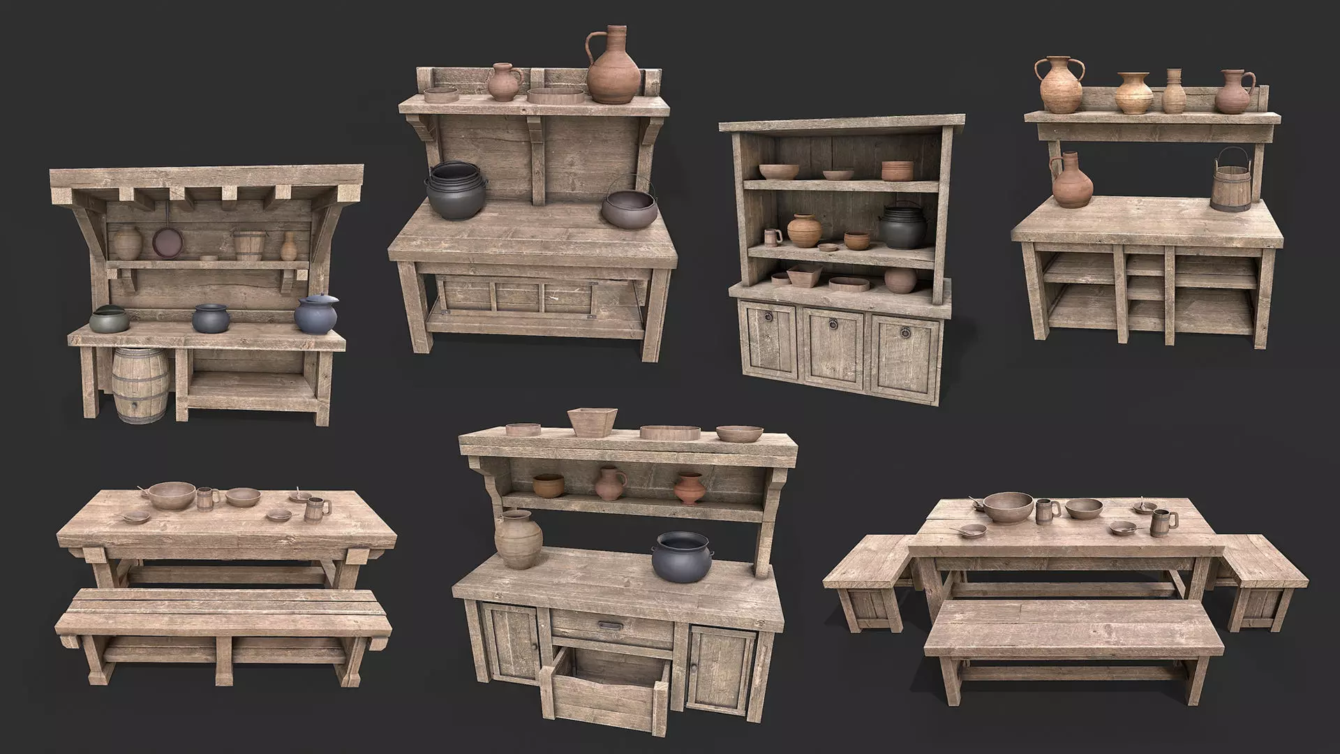 A complete set of medieval kitchen furniture and props, designed to create rich and believable cooking spaces.