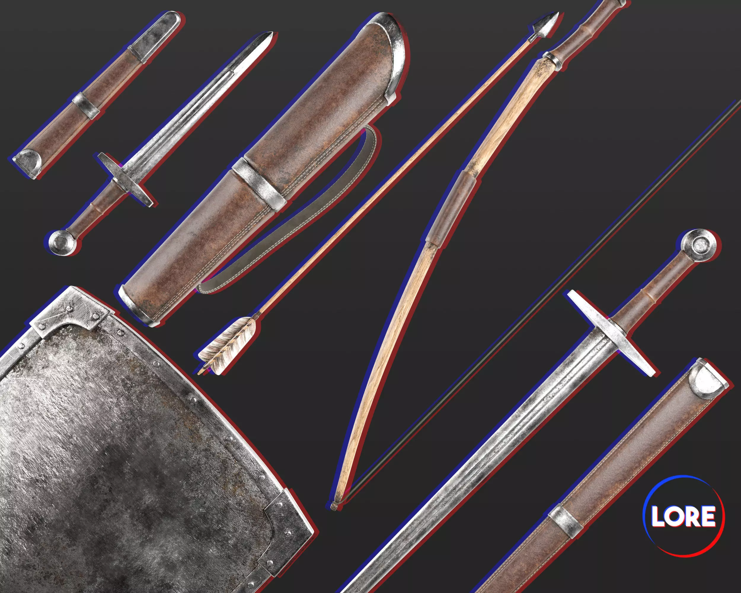 - Bow + Arrow & Quiver, Dagger + Sheath, Shield, Short Sword + Scabbard.