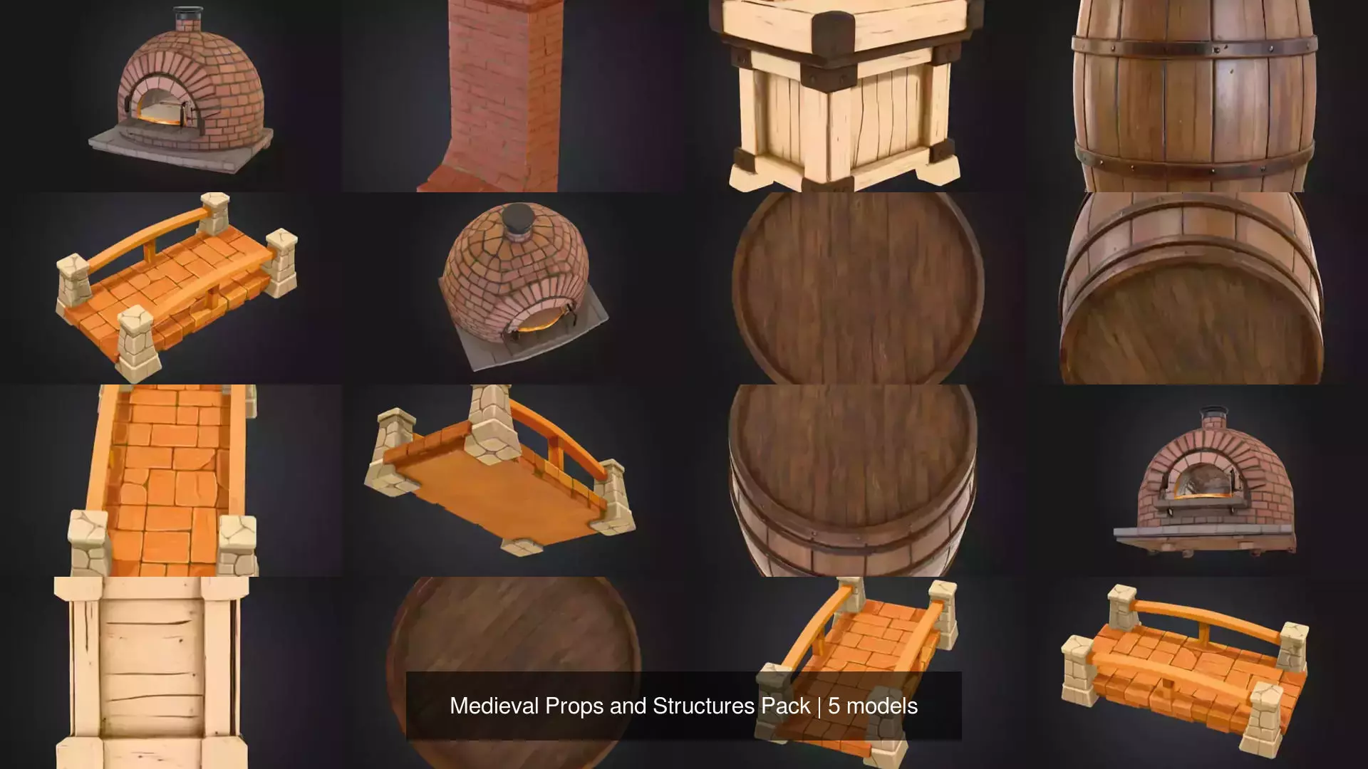 The Medieval Props & Structures Pack brings together a versatile collection of handcrafted 3D assets, perfect for populating rustic villages, cozy taverns, fantasy markets, or immersive RPG worlds. From sturdy barrels and crates to classic brick ovens and bridges, each model is designed with stylized details and warm textures to enhance storytelling and world-building. Whether you’re designing a medieval kitchen, blacksmith’s yard, or bustling town square, this pack provides essential environmental props for authentic atmosphere.