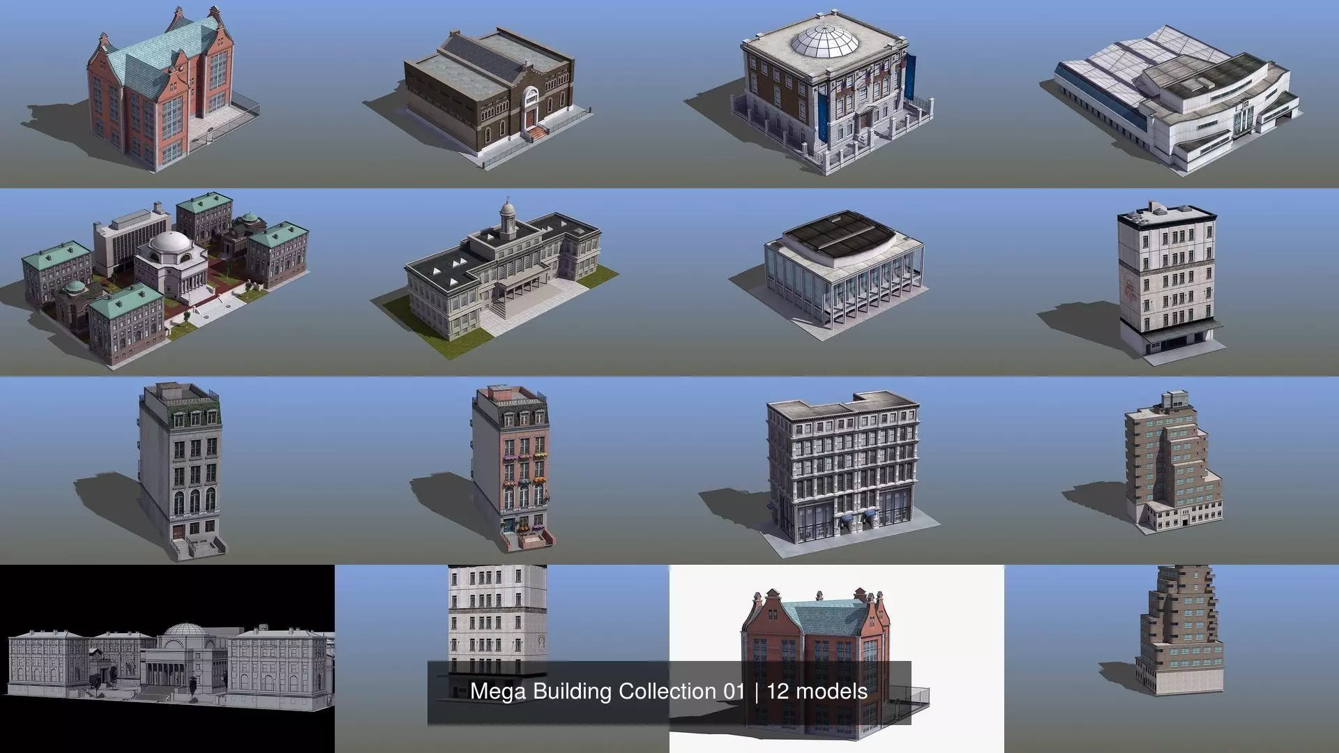 12 part Modern Building Mega Collection 01. Great set of multipurpose 3D models (ideal for offline rendering or real time uses such as games or simulation).