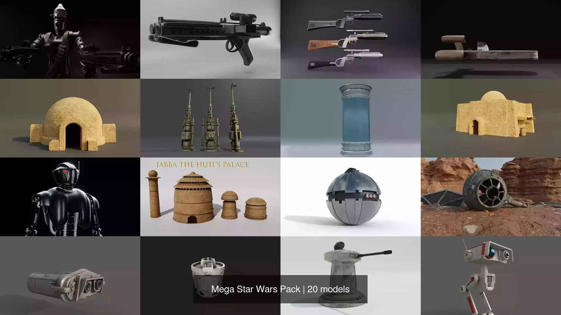 A collection of star wars models including droids, blasters, tatooine dwellings, aurabesh characters and more!