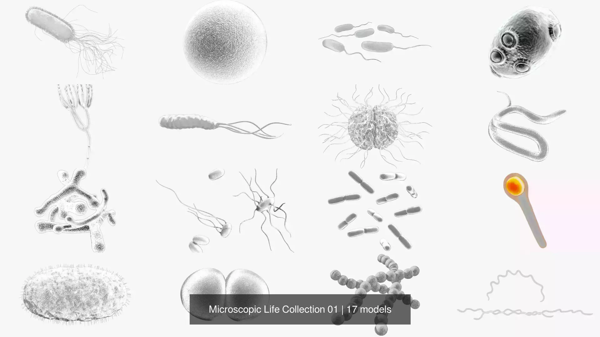 This comprehensive 3D bundle features 17 scientifically accurate models of bacteria, cells, and fungi, optimized for visualization, education, AR/VR, game development, and media production.