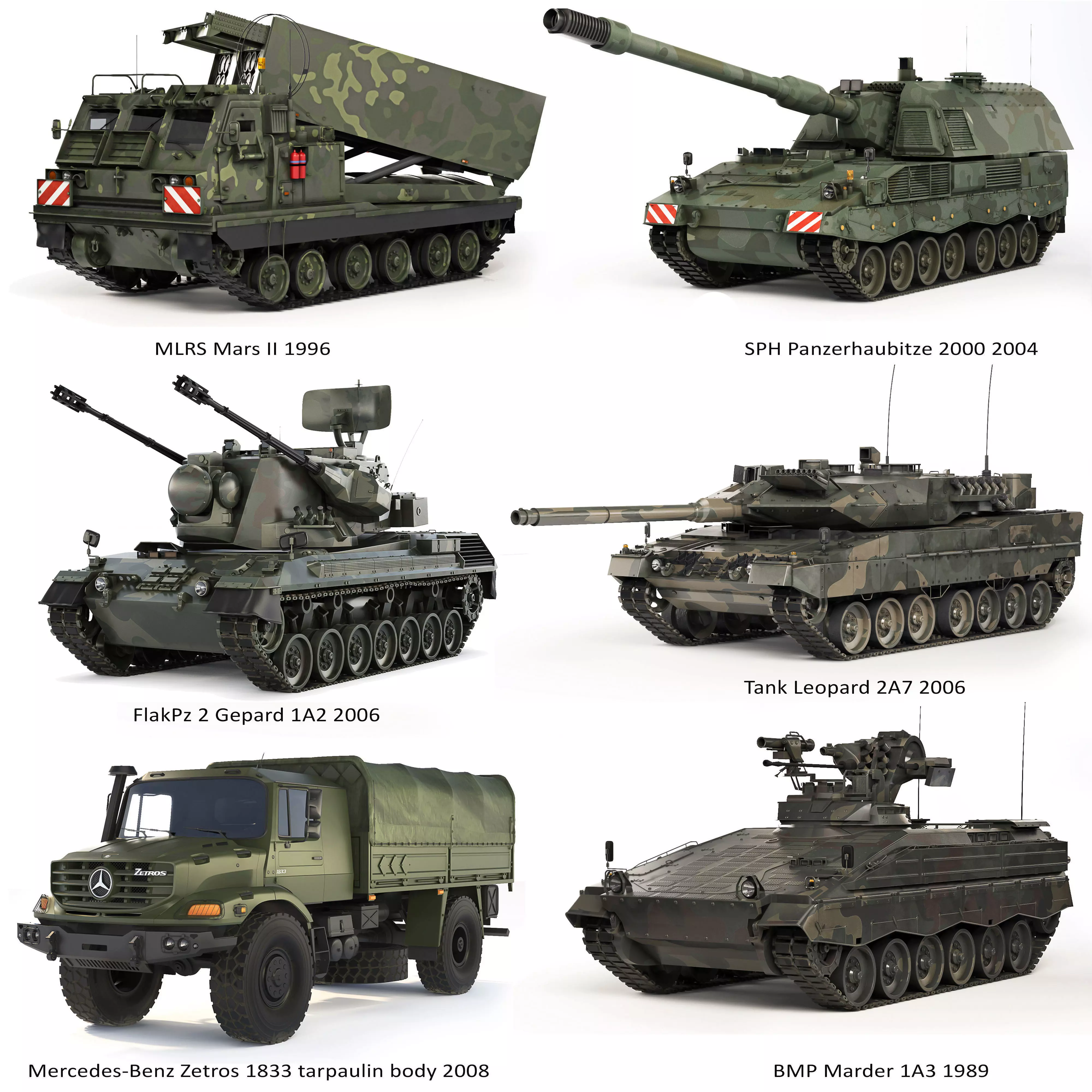 Military equipment of the German armed forces. The collection includes: BMP Marder 1A3 1989, MLRS Mars II 1996, SPH Panzerhaubitze 2000 2004, Mercedes-Benz Zetros 1833 tarpaulin body 2008, Tank Leopard 2A7 2006, FlakPz 2 Gepard 1A2 2006.