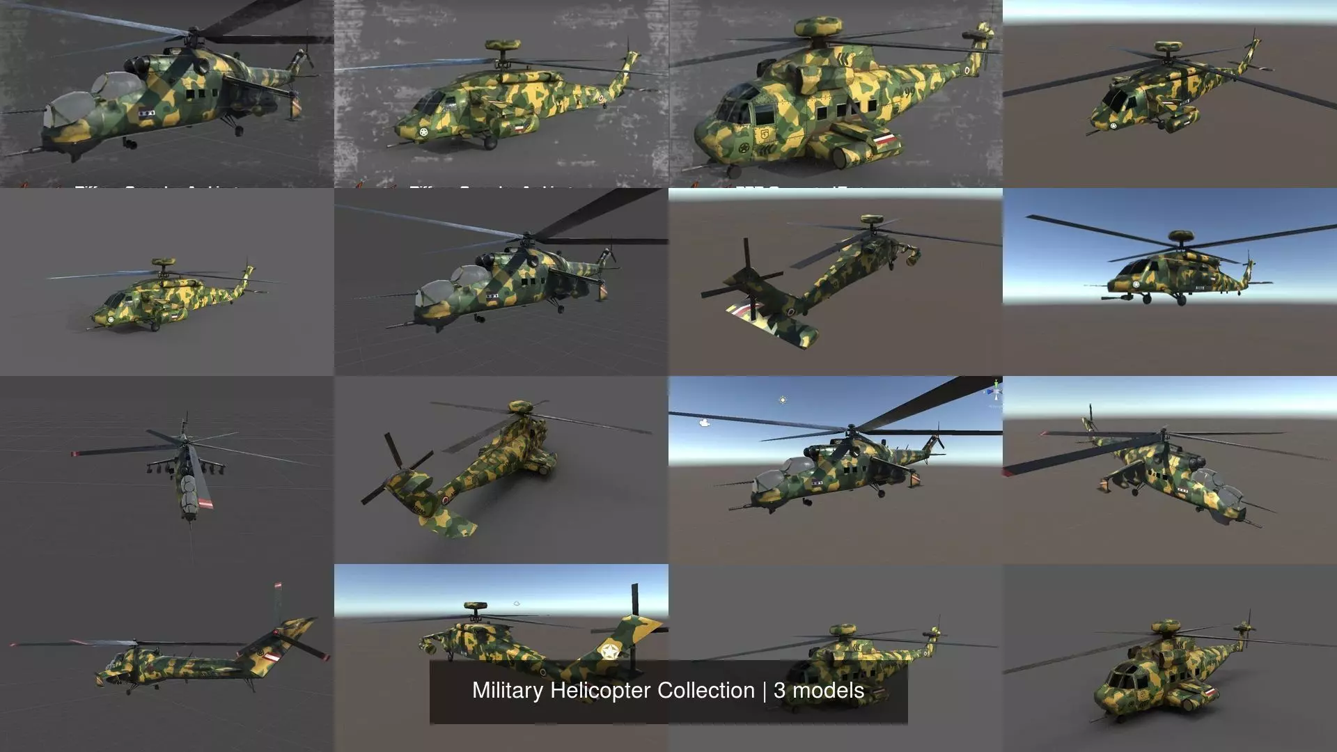 Military Helicopter collection that brings together packs currently available from Tiger Shark Studios.Game ready for sidescroller and third person adventures. Source file included to allow for modifaction and generation of new texture maps.