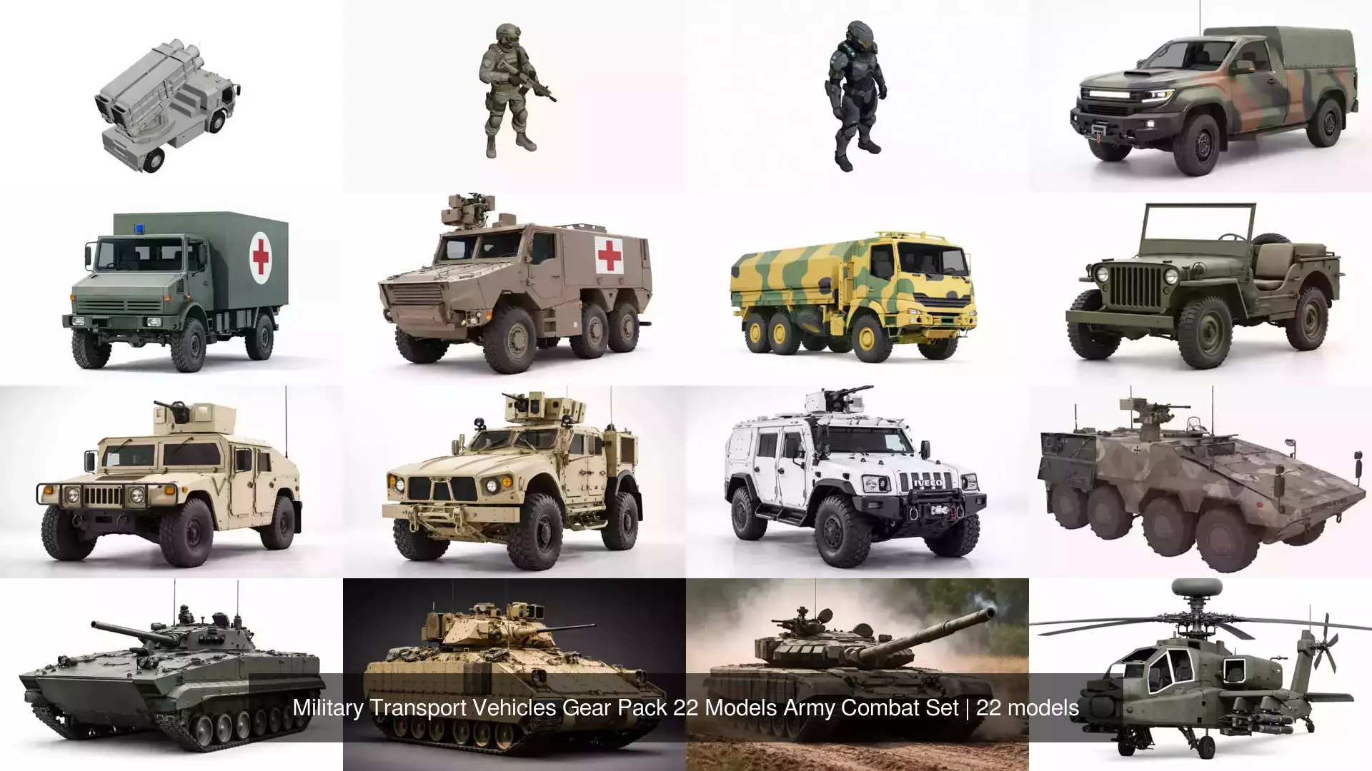 A complete military-themed collection including vehicles, equipment, and character assets designed for combat and logistics scenarios. This pack features helicopters, tanks, transport trucks, armored vehicles, submarines, tactical gear, and military characters.