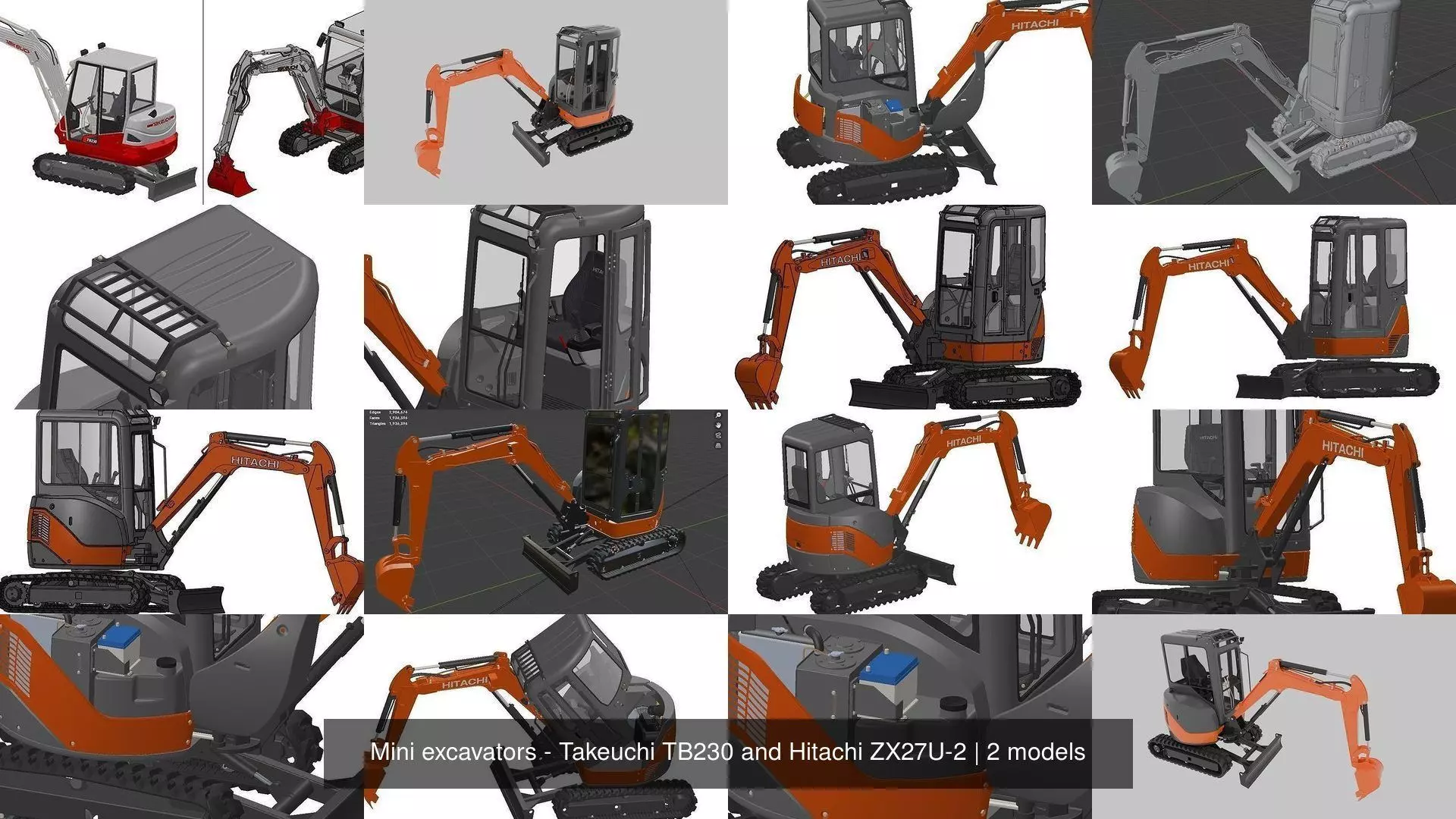 Modeled based on his blueprints of Hitachi Zaxis ZX27U-2 and Takeuchi TB230. It modelled as close to size as possible. Mini excavators are heavy construction equipment consisting of a boom, dipper, bucket and cab on a rotating platform.