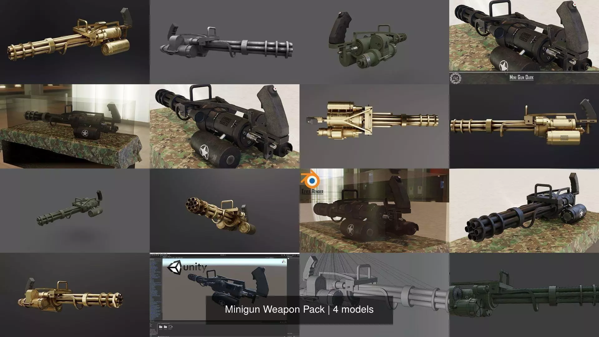 Game ready lowpoly Minigun Asset.includes 4 Minigun: Golden, military gree,iron,Dark cost $53.