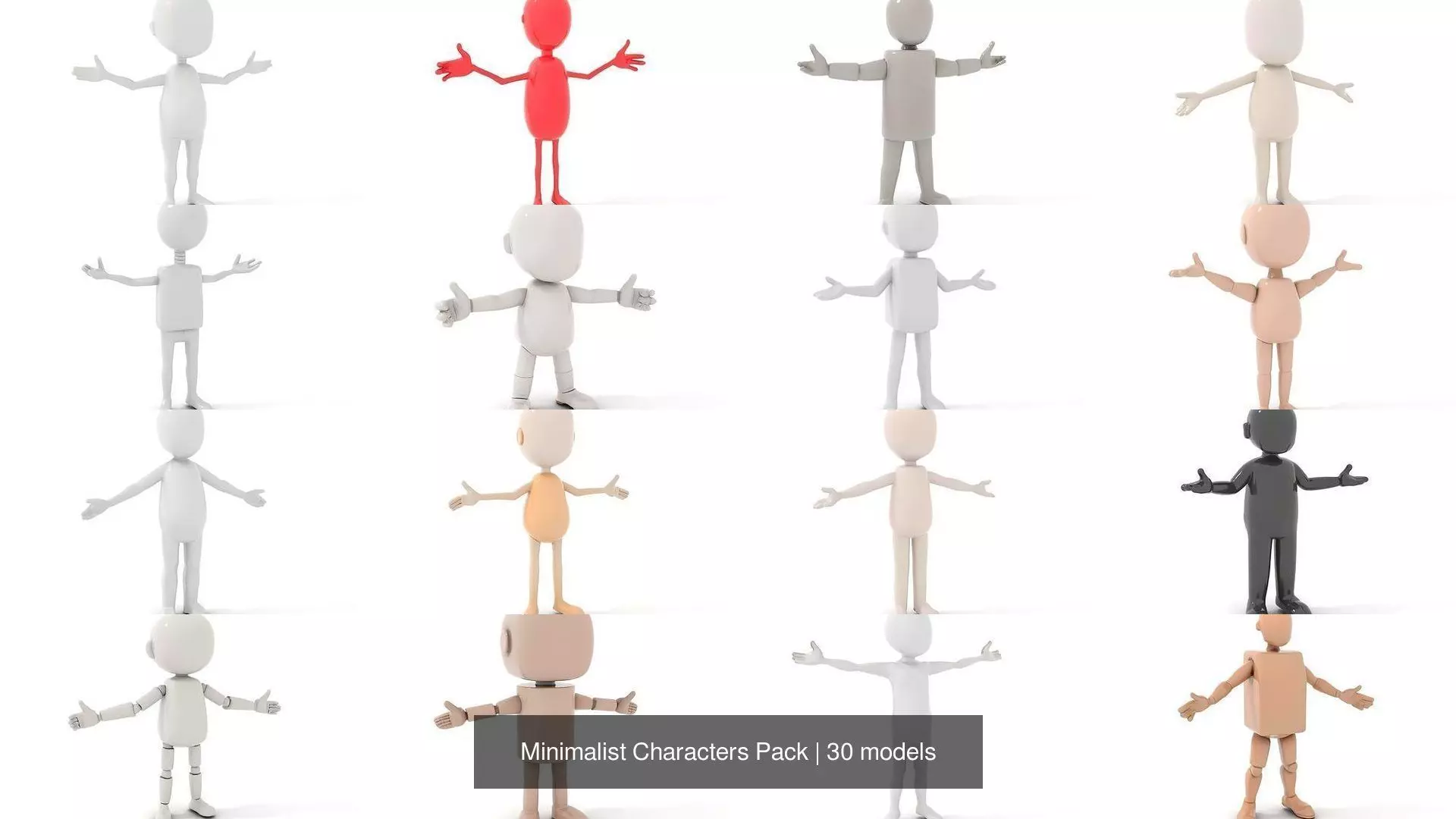 The Minimalist Characters Pack brings to life a collection of 3D models that embody whimsical charm and emotive depth through minimalistic design. Each character in this collection features an oval head, cylindrical limbs, and a rectangular torso, all presented in a muted matte palette of colors like blacks, greys, and reds. Despite their lack of facial features, these characters convey emotion and narrative through expressive stances, specifically standing in a T-pose. Their simplistic, geometric forms offer a silhouette-focused approach, transforming basic shapes into dynamic storytelling tools. Ideal for animations, games, or artistic projects, this pack offers endless imagination and creativity.