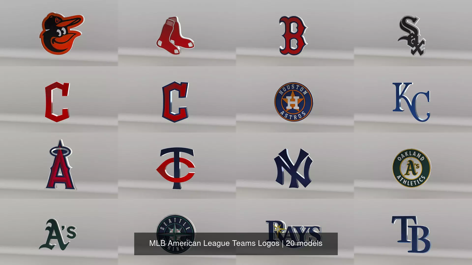 MLB American League Teams Logos modeled and rendered in Maya using Redshift and textured in Substance Painter. It contains PBR Textures. The renders are using the metallic texture, but if you don't use it you have the logo with it's original color, like the last picture.