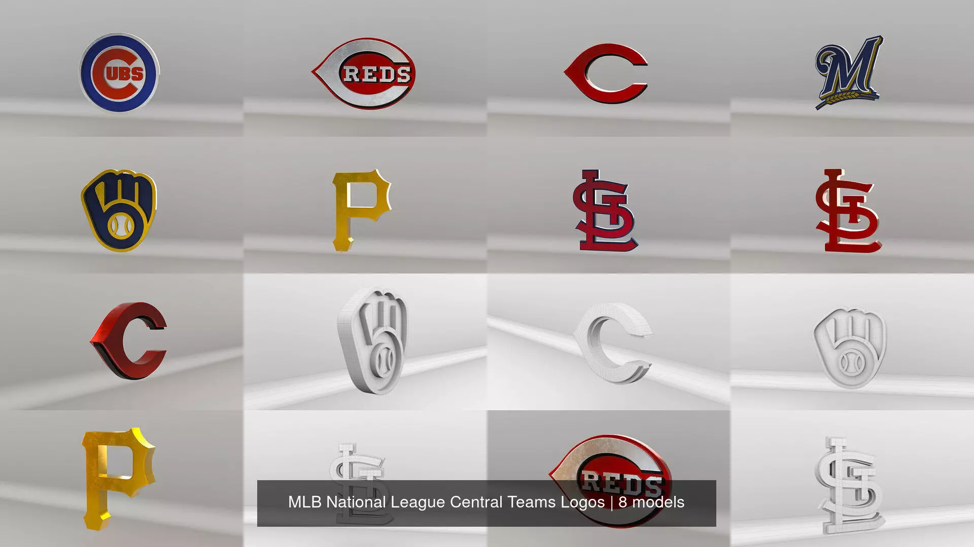 MLB National League Central Teams Logos modeled and rendered in Maya using Redshift and textured in Substance Painter. It contains PBR Textures. The renders are using the metallic texture, but if you don't use it you have the logo with it's original color, like the last picture.